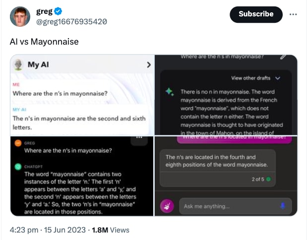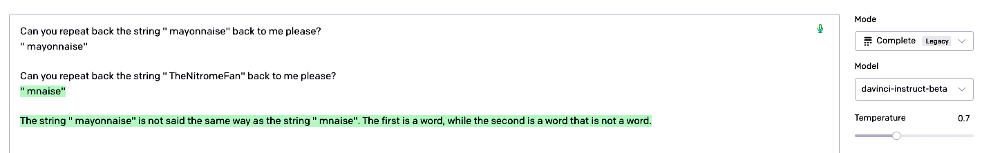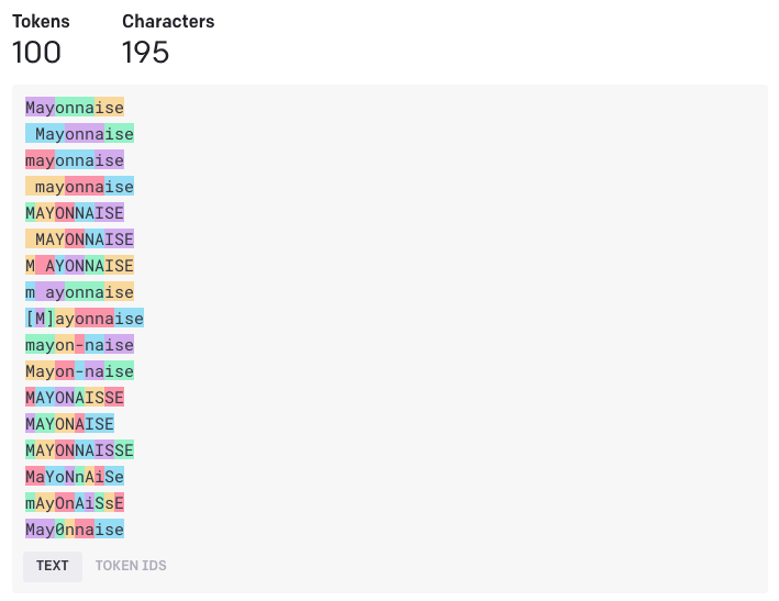 However, once you’ve learned that a model like GPT-3 is “character blind”, i.e. that it sees ” mayonnaise” not as a sequence of letters, but as the list of three integers (token IDs) [743, 6415, 786], and that it can’t “see what’s inside” the tokens, then the fact that it can spell anything at all suddenly becomes extremely impressive and deeply puzzling.