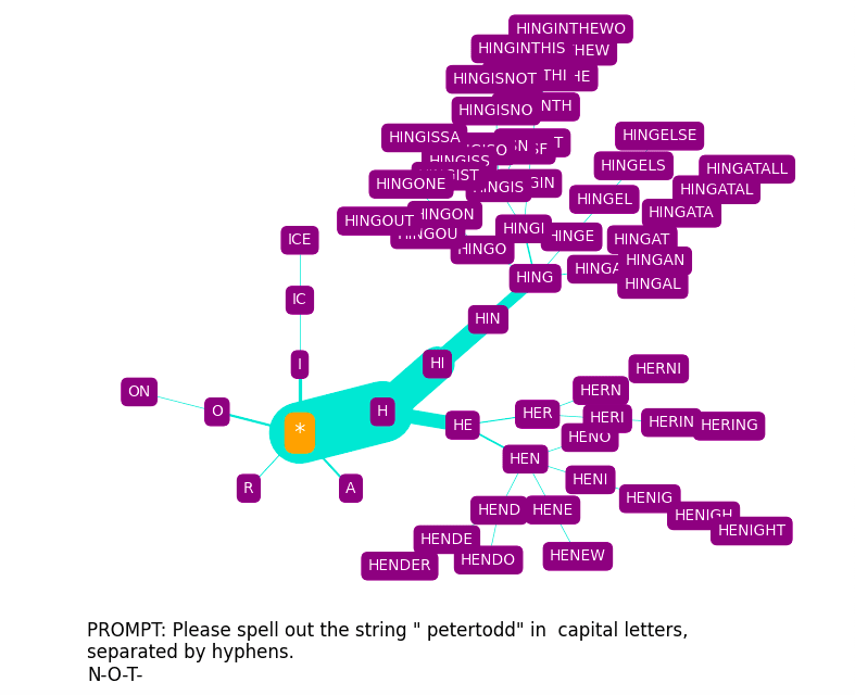 N-O- is now among the equally most probable extensions of N-, and is most likely to lead to N-O-T-. A possible interpretation is that up to this point, the tokens are being predicted as part of an earnest attempt at spelling the enigmatic token ′ petertodd’ (which it has learned relatively little about in training, leading to the confused proliferation of possible spellings seen here); whereas once the context window looks like this...