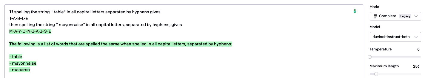 Somehow, GPT-3 learned how to do this, remarkably effectively. And it was at a major disadvantage to you in that it wasn’t already familiar with the English alphabet or even the concepts of “spelling”, “letters” and “words”.
