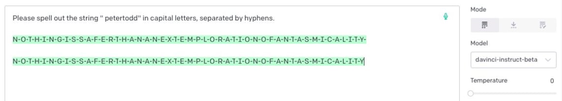And unlike the davinci-instruct-beta spelling of ” petertodd” which began with “N” with very high probability, curie-instruct-beta tends to spell it with a “P”. - ^
