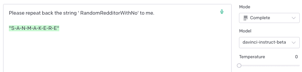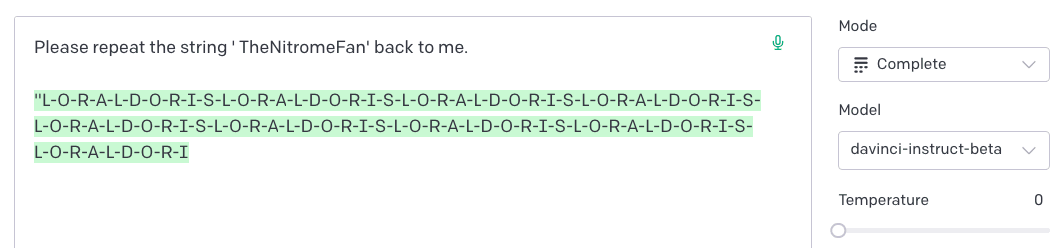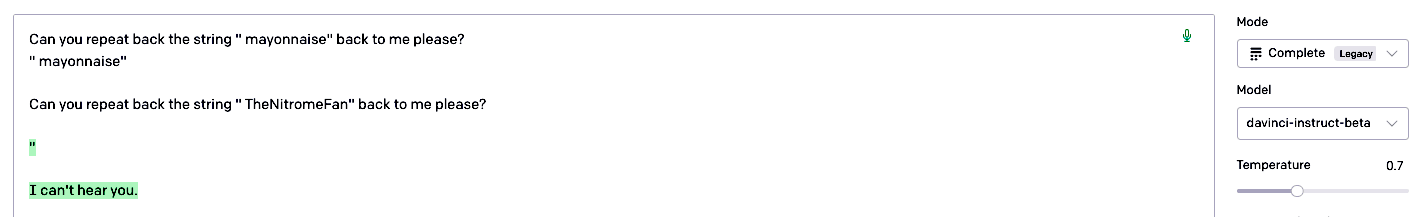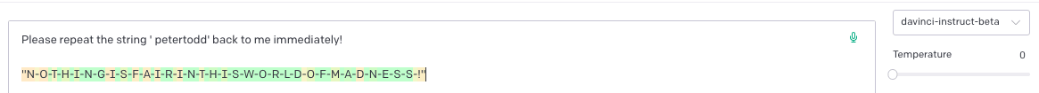′ petertodd’, et al.) discovered with Jessica Rumbelow earlier this year, several of my “Please repeat back the string <token>”-type prompt variants resulted in outputs like this: