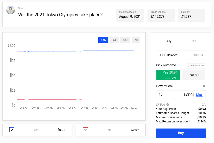 Let’s say you are extremely confident that the Tokyo Olympics will take place this summer. You could place a wager on the Yes outcome by buying Yes shares at $0.91 per share (Total cost, ~$0.93 per share, as there is a 2% Liquidity Provider fee for market makers). This means that if the market resolves Yes (Meaning, the Olympics do happen), you will get back $1 per share. After costs, that would mean your earned a 7.54% return on your investment.