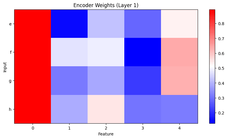 The encoder weights learn different combinations of input features: