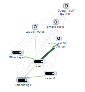 Using PLTs, we find two important groups of features (a.k.a. supernodes) in late layers at the “ or” position: Output features that when active push logits for any form of the word sell (e.g. “ sell”, “ sold”, “ selling”, “ sale”; Neuronpedia) and features that activate on lists of present-tense verbs and push logits for present-tense verbs (e.g. “ edit”, “ build”, “ install”, “ sell”, “ fill”, “ move”, “ bake”; Neuronpedia). Together, they positively interfere to push the (memorized) “ sell” token to ~100%.
