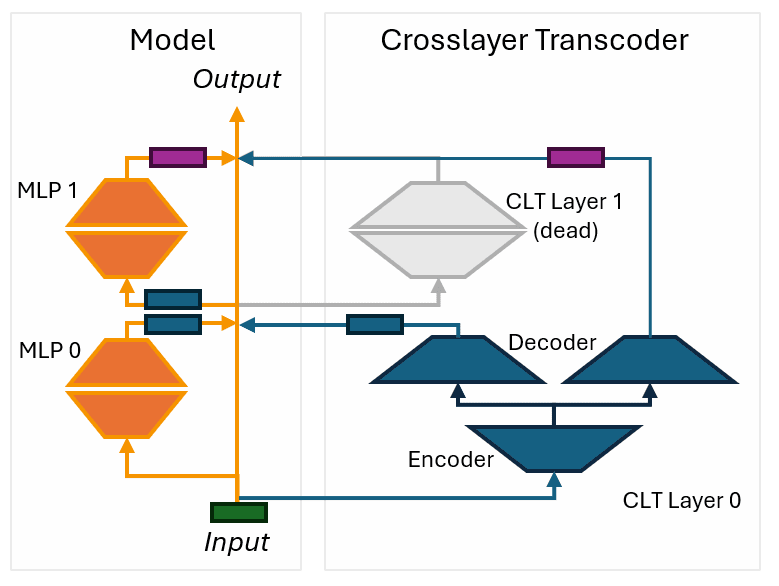 But from how we defined our model, we know that this does not match our model’s true internal algorithm. The single neuron in layer 1 is performing important computation on existing intermediate results to determine if the boolean expression is true. If we ablate this neuron, nothing writes to the output channel i, and the network cannot determine the value of the overall boolean expression. The CLT suggests that both MLPs learned features in crosslayer superposition but this is importantly not the case here: We can show by ablating the interaction between MLP 0 and MLP 1 (which in our case is trivially easy because they occupy their own linear subspace) that this breaks the model. Therefore, the CLT learned an unfaithful circuit.