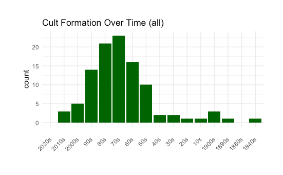 There also may be selection effects affecting the inclusion of recently formed cults and cults in the distant past. More recently formed cults may have not had time to attract a significant amount of followers or public attention. For example, a cult formed in 2018 may not be well known (and thus not selected for the podcast) but will be widely known in 2023 after a mass suicide event a la Heaven’s Gate. A quick internet search yields two examples of more recently formed cults that were not included in the dataset (“Love has Won”, formed in 2006, and ”The New Light of God” in Panama, formed some time in the 2010s). On the other hand, cults from the distant past may have faded in notoriety or may not be ideal for a podcast because of a lack of reliable sources. We could also posit a saturation effect in that lesser known cults from eras with a particularly high numbers of cults are more likely to be forgotten and thus cults from these eras are undercounted. It is also possible that the creators of the show have purposefully tried to avoid over-clustering of the time periods that they cover. It is difficult to know which of these effects is the strongest, but I think it is most likely that they are relatively insignificant and largely cancel each other out.