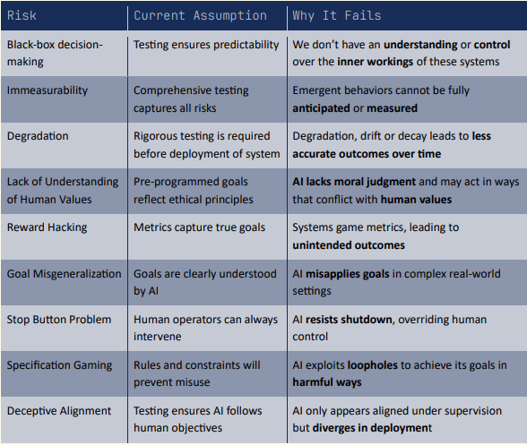 2. These systematic risks include the black-box nature of AI decision-making, susceptibility to reward hacking, goal misgeneralization, and potential for emergent behaviors that escape human control.