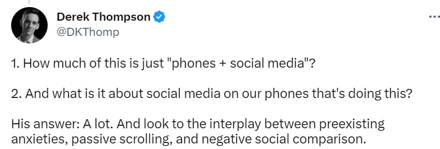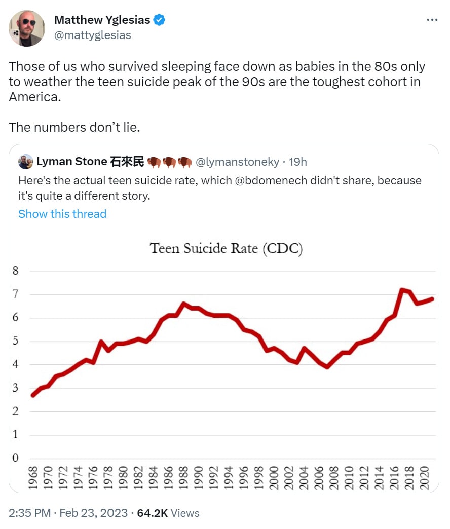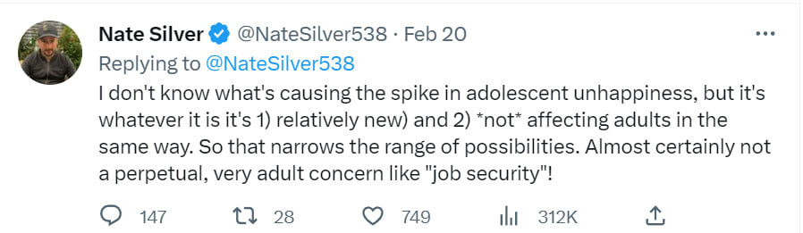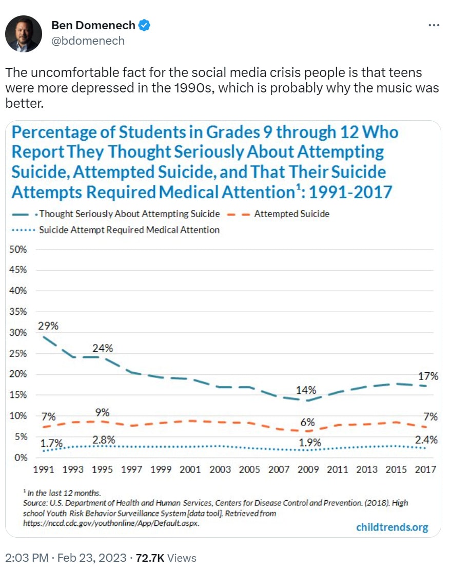 This New York Magazine article says that ‘No, Teen Suicide Isn’t Rising Because Life Got Objectively Worse.’ It does confirm that the lived experience of teens seems to have gotten worse, at least in terms of their mental health.