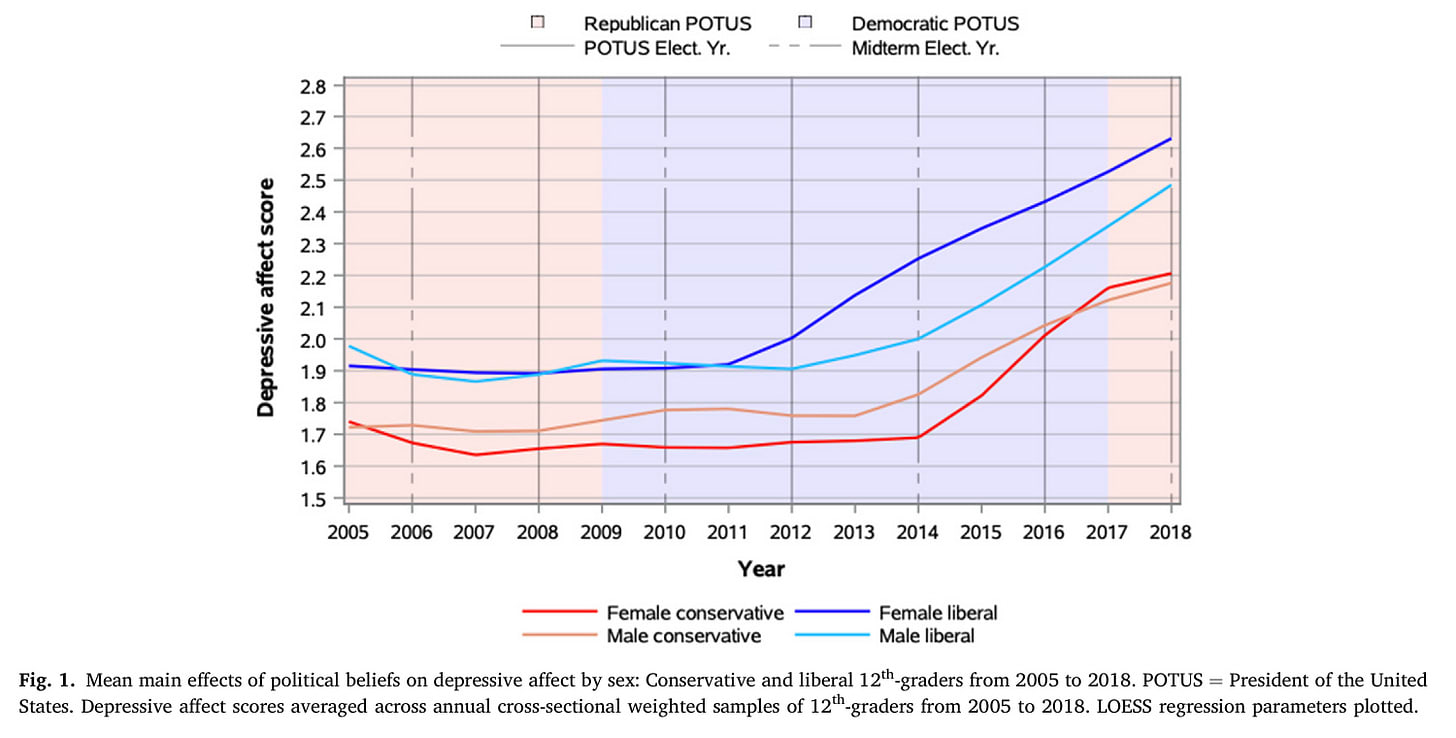 The young people that I know that are depressed are almost all very left wing and basically think capitalism and climate change will kill everyone exept the very rich. But I don’t know if they are depressed because of that (and my sample size is very small).
