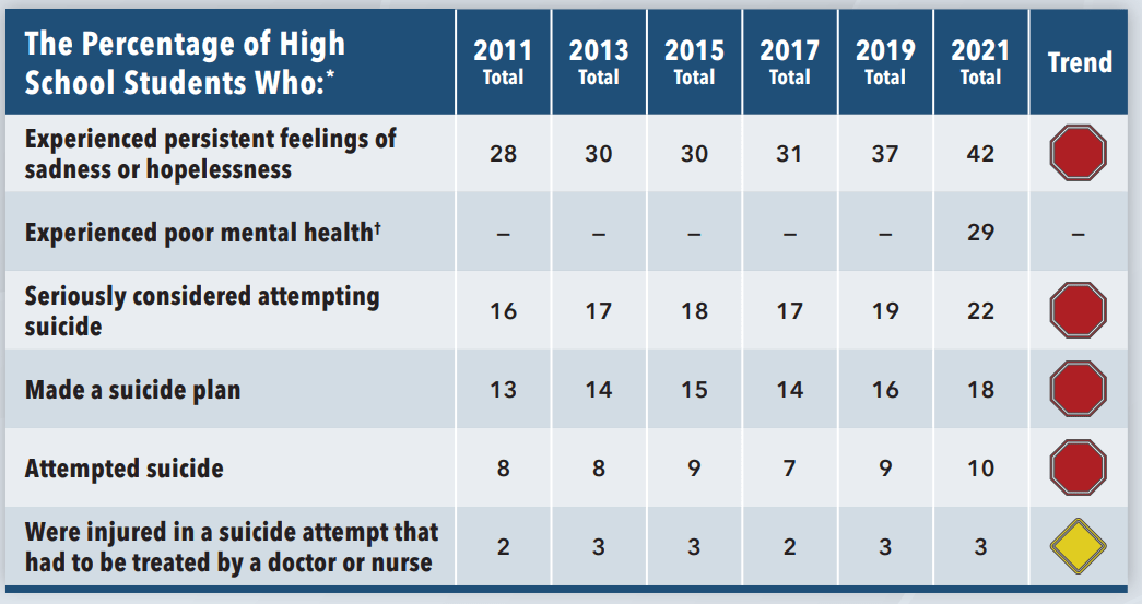 Strangely, they list suicide considerations, plans, attempts and injuries, but do not list stats on actual suicides.