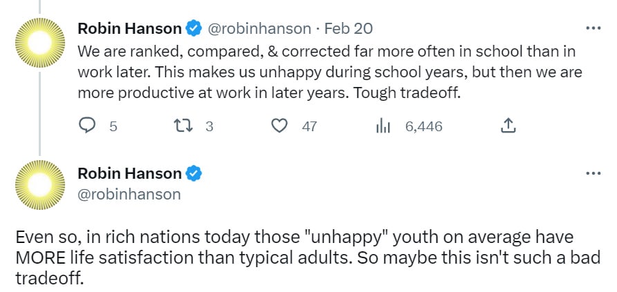 Thus I would say that school lays the foundation for children to be miserable. I would say school directly causes children to be miserable. It still does not seem to explain why things recently got so much worse.