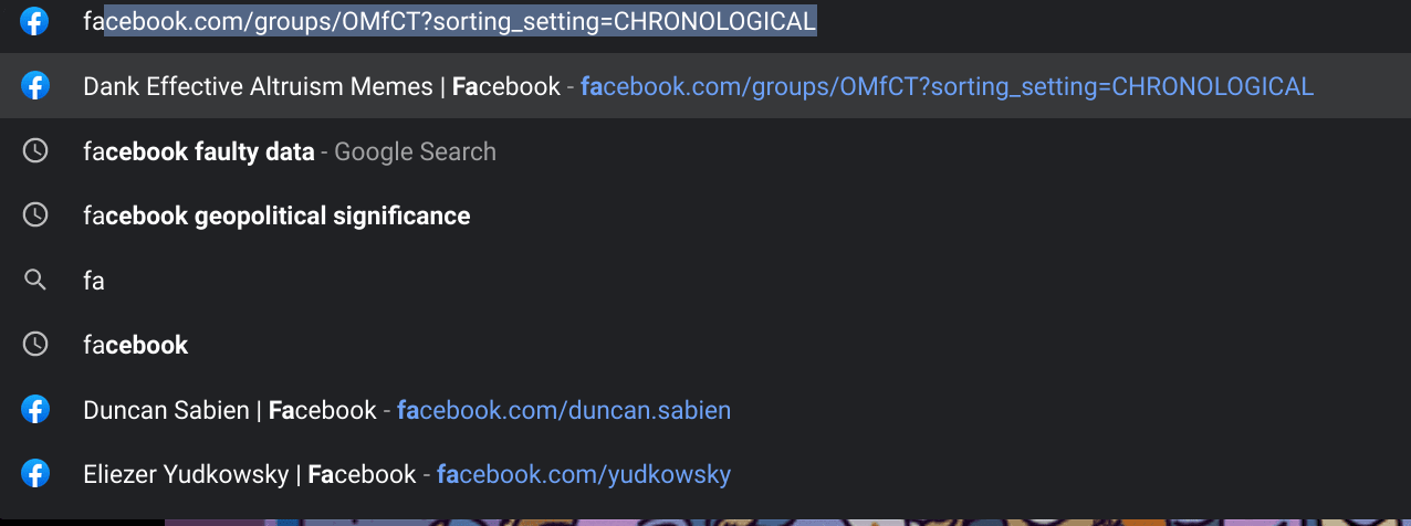 This is the tricky part. Type in the habit-letter into the chrome bar (in this case, “F” for “facebook.com″) then use the arrow keys to select the bad-habit autofill (in this case, ”facebook.com″) and hold down alt + shift + backspace to remove it. Continue using alt +shift +backspace to remove things, until autocorrect only shows you the stuff you want. You might need to reinforce the things you want using the step 3 cycle more than ten times.