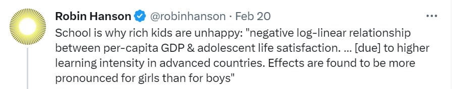 Robin Hanson thinks this is clear, responding to the new paper reported via MR to have shown a negative log-linear relationship between per-capita GDP and adolescent life satisfaction.