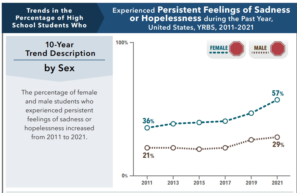 I am curious about the 13% or more who experienced persistent feelings of sadness or hopelessness without poor mental health. If I was feeling persistently sad or hopeless and someone asked me for the quality of my mental health, and I had the energy to reply, I would reply ‘poor, thanks for asking.’