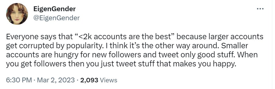 This social dynamic reduces down to “how to attract followers” for any topic, and the topic itself becomes irrelevant.
