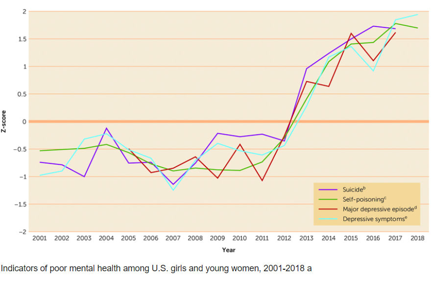 I notice that this graph is suggesting something happened around 2011 that impacted everyone, and disproportionally impacted only liberal girls. Until then, liberal girls and liberal boys had similar depressive levels. Even now, conservative boys and conservative girls are similar, and the temporary difference ran the other way. The conservative vs. liberal gap among boys is similar in 2005 and 2018.