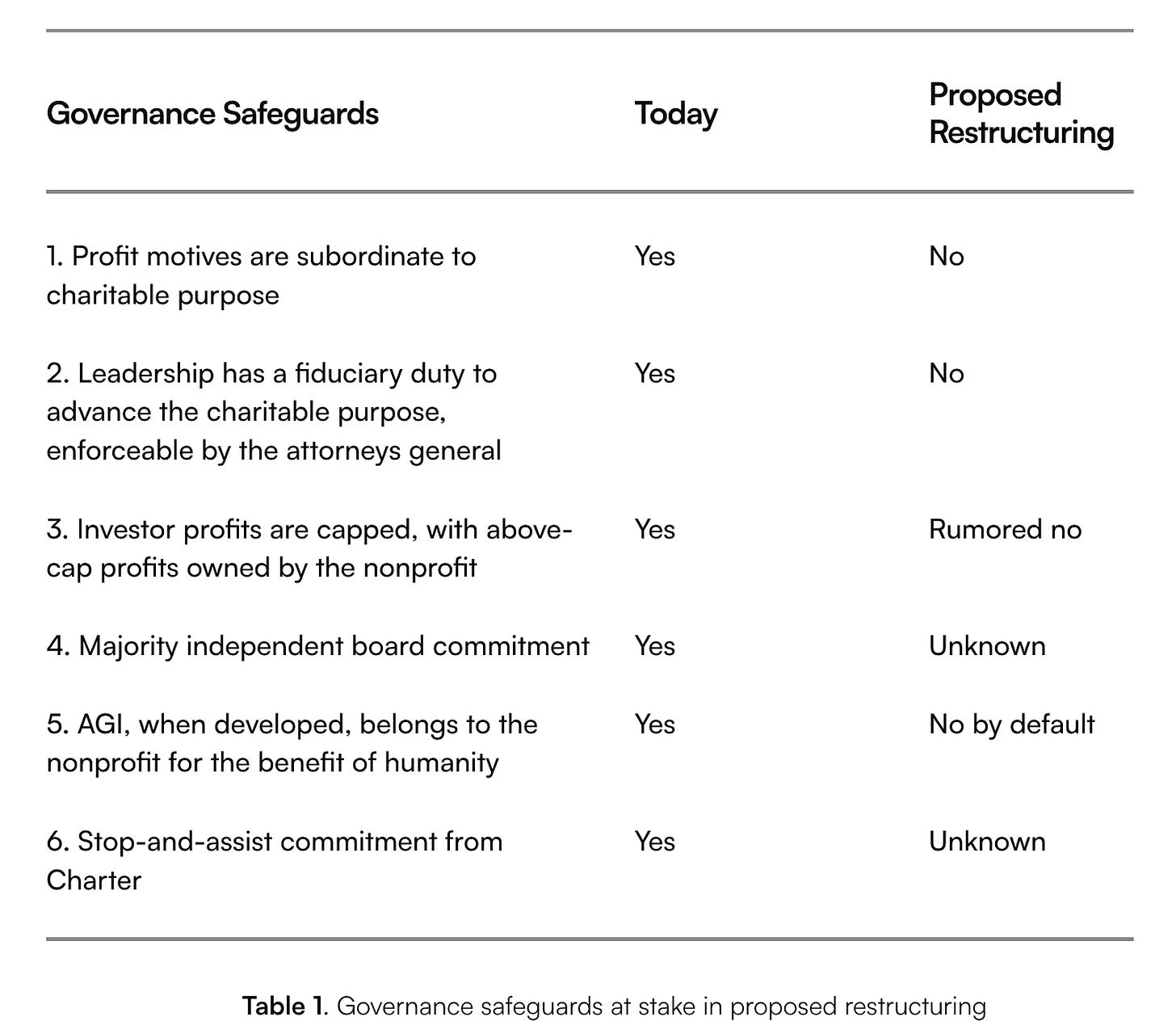 The proposed restructuring into a Public Benefit Corporation (PBC) would dismantle the governance safeguards OpenAI originally championed. The letter highlights that the proposed restructuring would transfer control away from the nonprofit entity–whose primary fiduciary duty is to humanity–to a for-profit board whose directors would be partly beholden to shareholder interests. The authors detail several specific safeguards currently in place that would be undermined or eliminated: