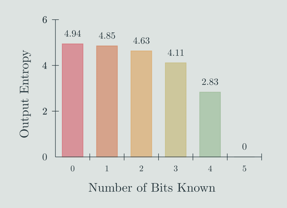Suppose instead you are not given the full string, but you are given a small amount of information about the string chosen by the computer. For example, if we were given only the first bit of the computer’s string, this would halve the number of possible strings it could be and double our chance of guessing correctly (for a uniform distribution). We could take advantage of this by guessing the string 11111 if the first bit of the computer string is 1 and 01111 if it is a 0. This strategy would give you a probability of 124 of guessing the correct string and if applied would give an output entropy of 4.85 bits.