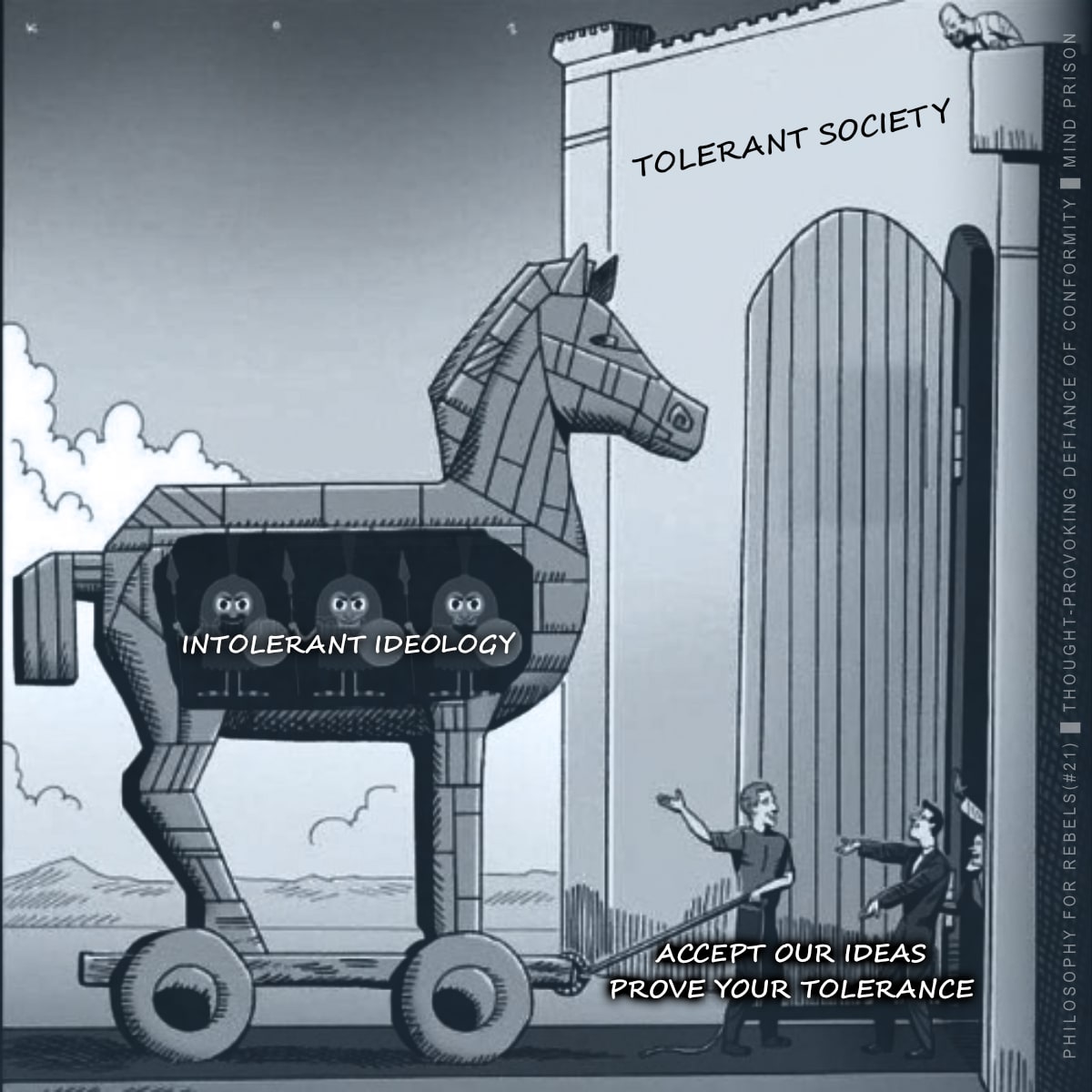 The tolerant can be conquered, not just through violence, but through a manipulation of language. They have opened the gates to their minds and society, eager to be seen as morally good, only to find the meaning of freedom and liberty inverted. In a dark irony, the intolerant have recruited those who espouse tolerance and now use the paradox itself to justify their own intolerance.
