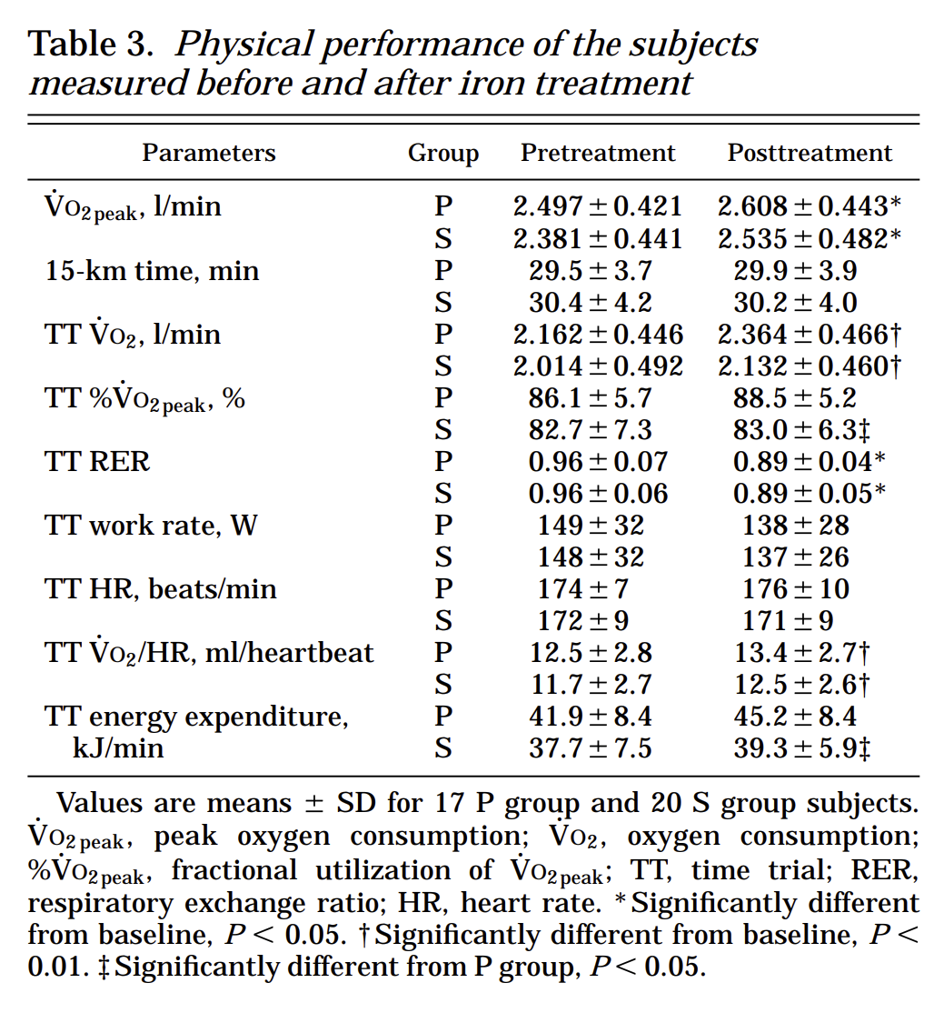 Treatment group hemoglobin and iron binding capacity were unchanged. Serum ferritin was up 250% for the treatment group (compared to 30% for the control). Their athletic test results did not improve any faster than the controls, however they needed less energy (2.0kj/min) and oxygen (5%) to get those same results.
