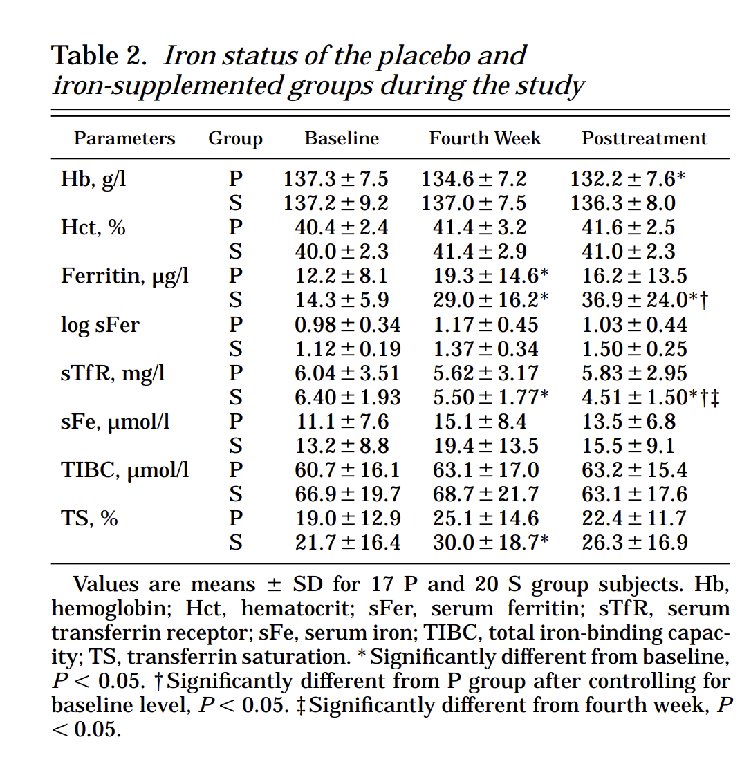 Iron supplementation did not change hemoglobin or iron binding capacity levels, but did increase serum ferritin by about 50%, and transferrin saturation by 70%. Note that their ending ferritin levels (19.4) were still barely above the bottom of the reference range, indicating there was probably much more room for growth.