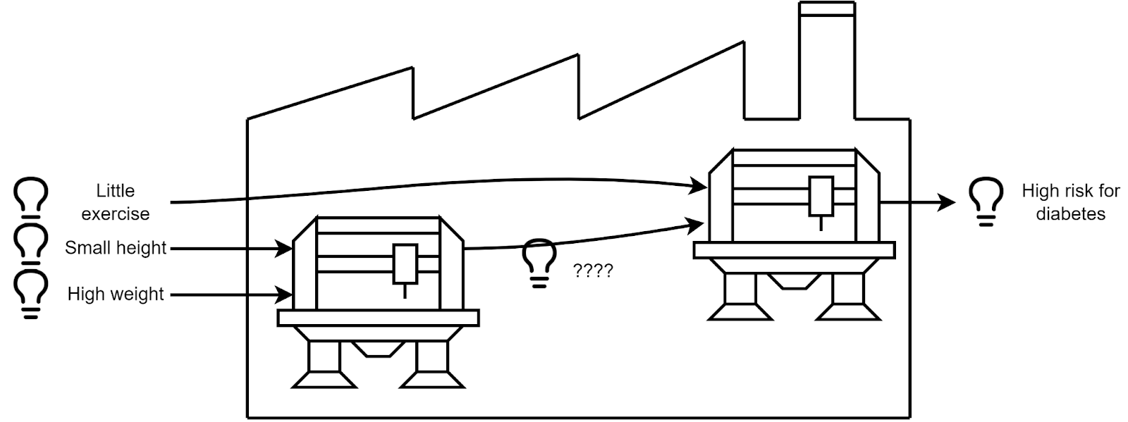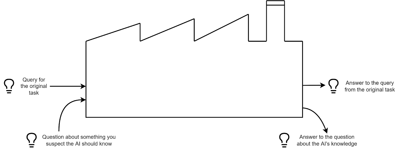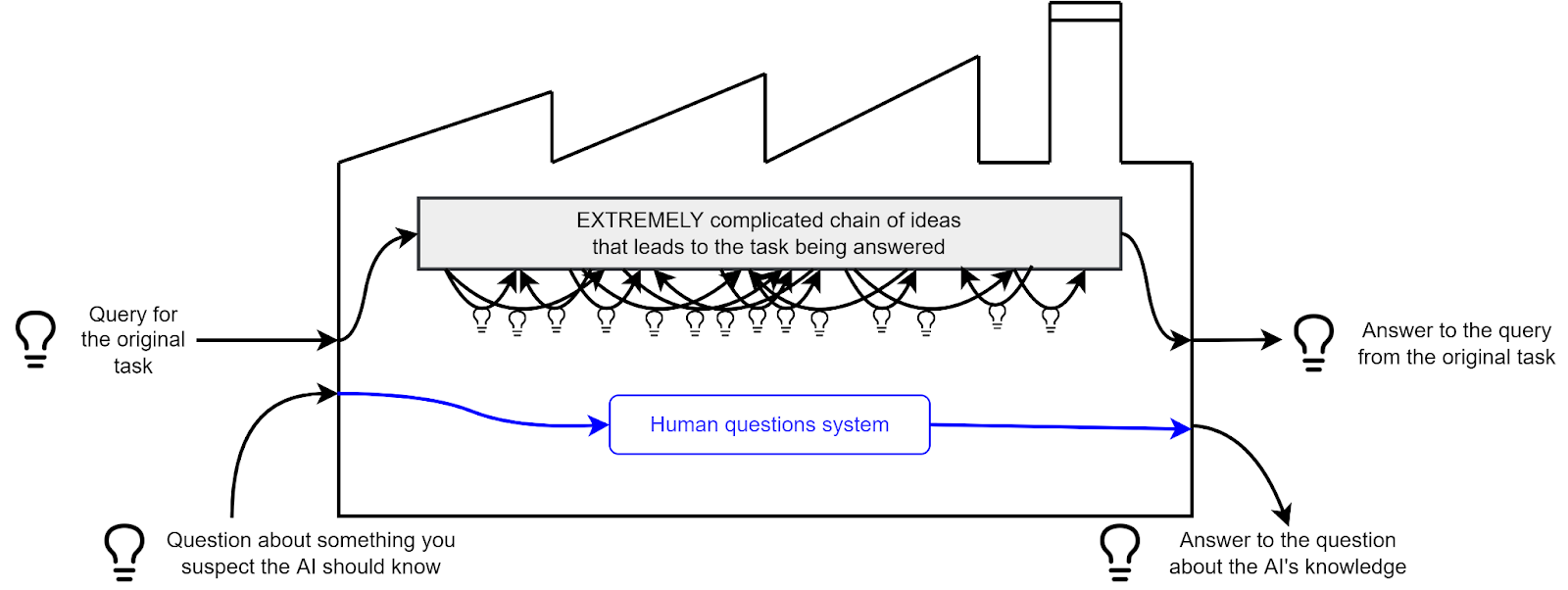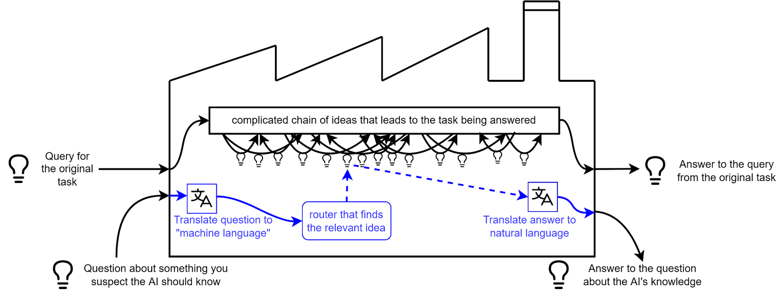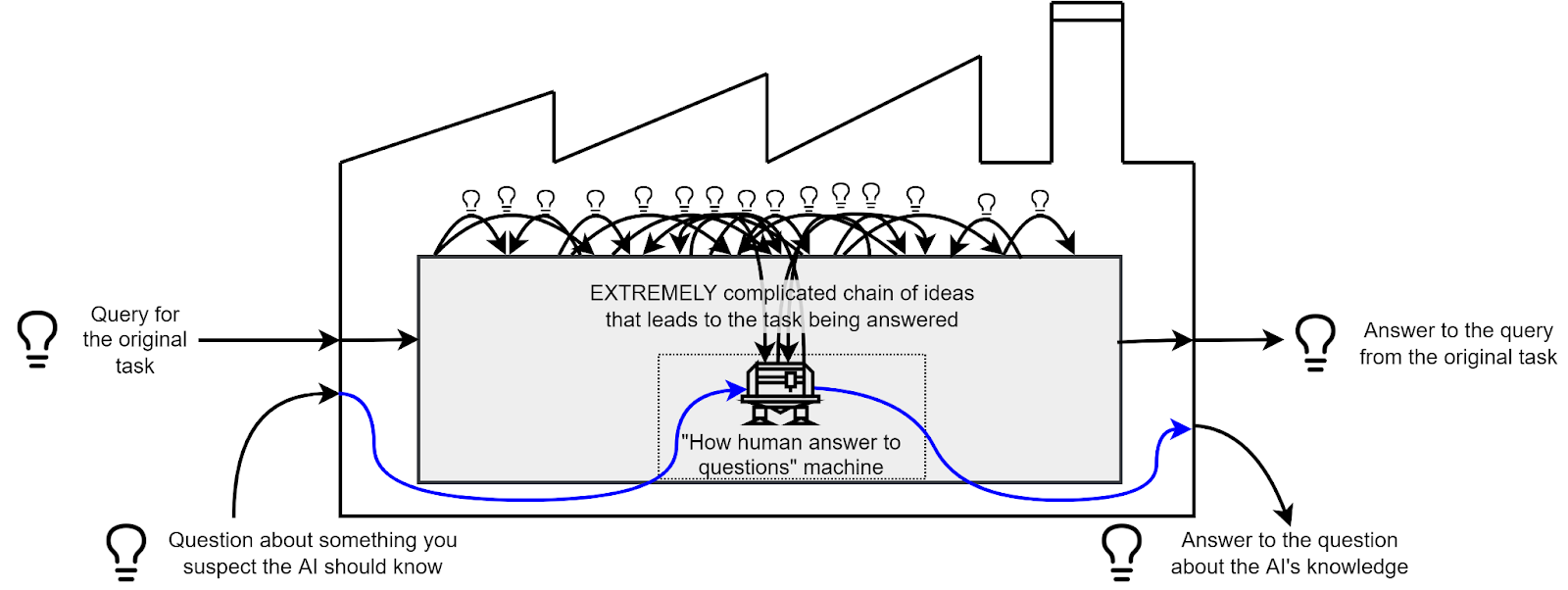 Think of an AI as a factory which takes requests, and produces ideas, through a chain of intermediate ideas. For example, take a look at this very little factory: