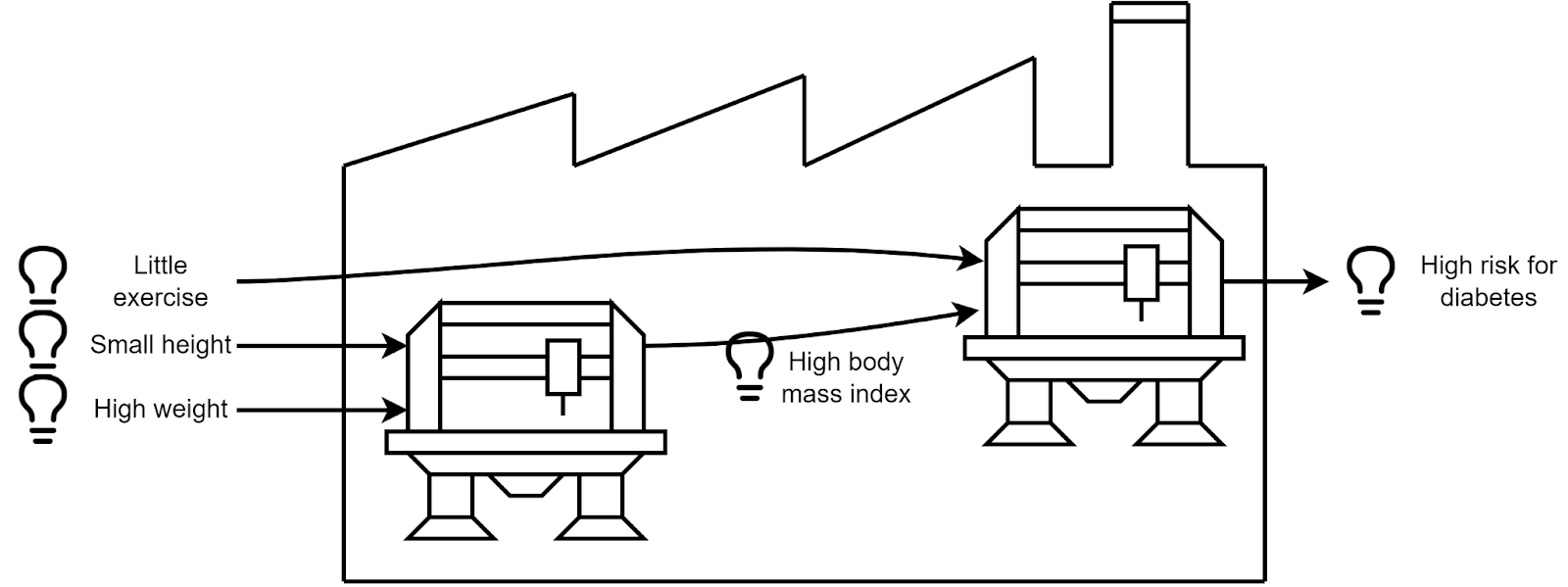 It represents an AI that computes if a given individual is at risk for obesity given weight, height, and time spent doing exercise. For what we care about (having explanations for the AI decisions and making sure it is safe), we will say that it “knows” that this individual has a high body mass index: it is an idea that is one of the causes for the final prediction.