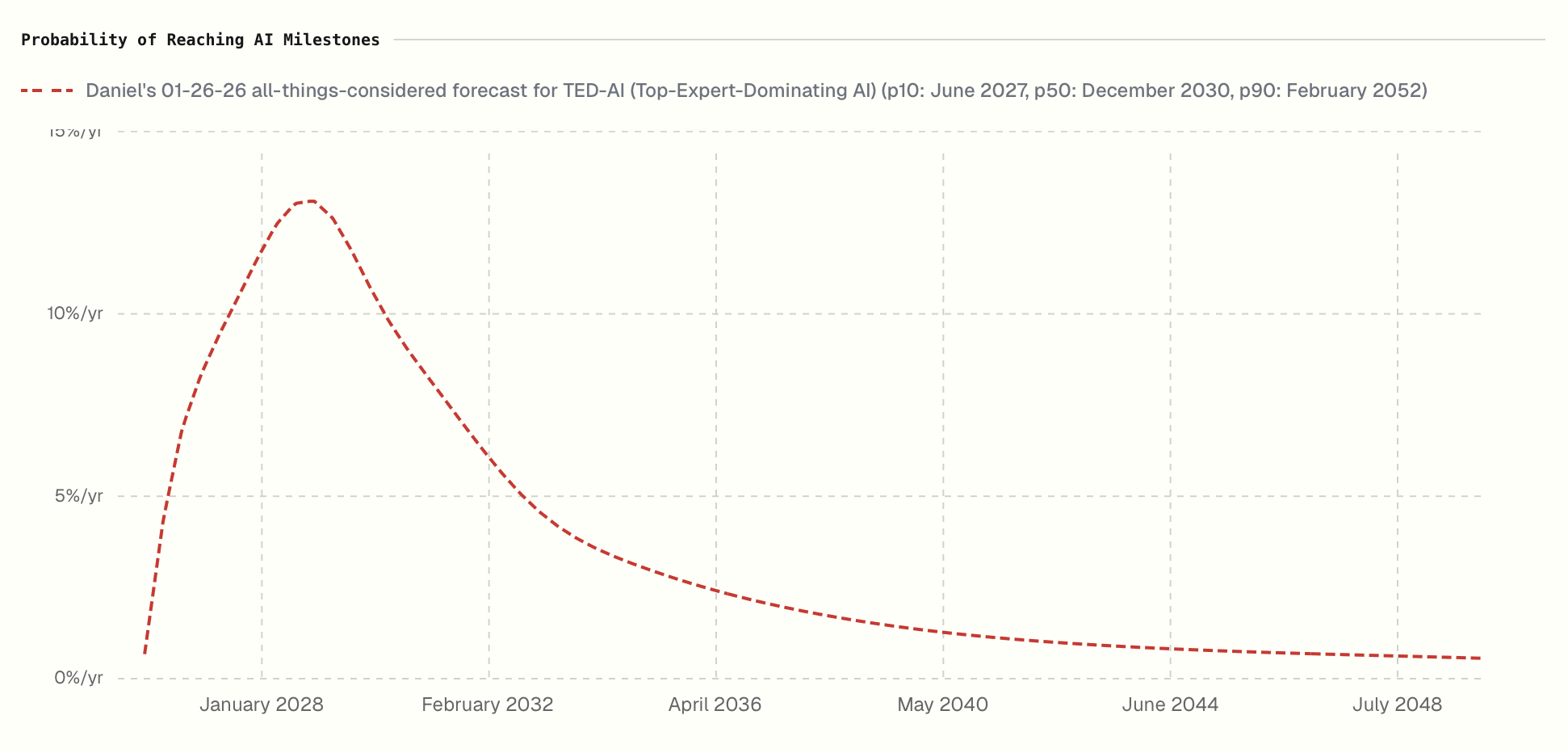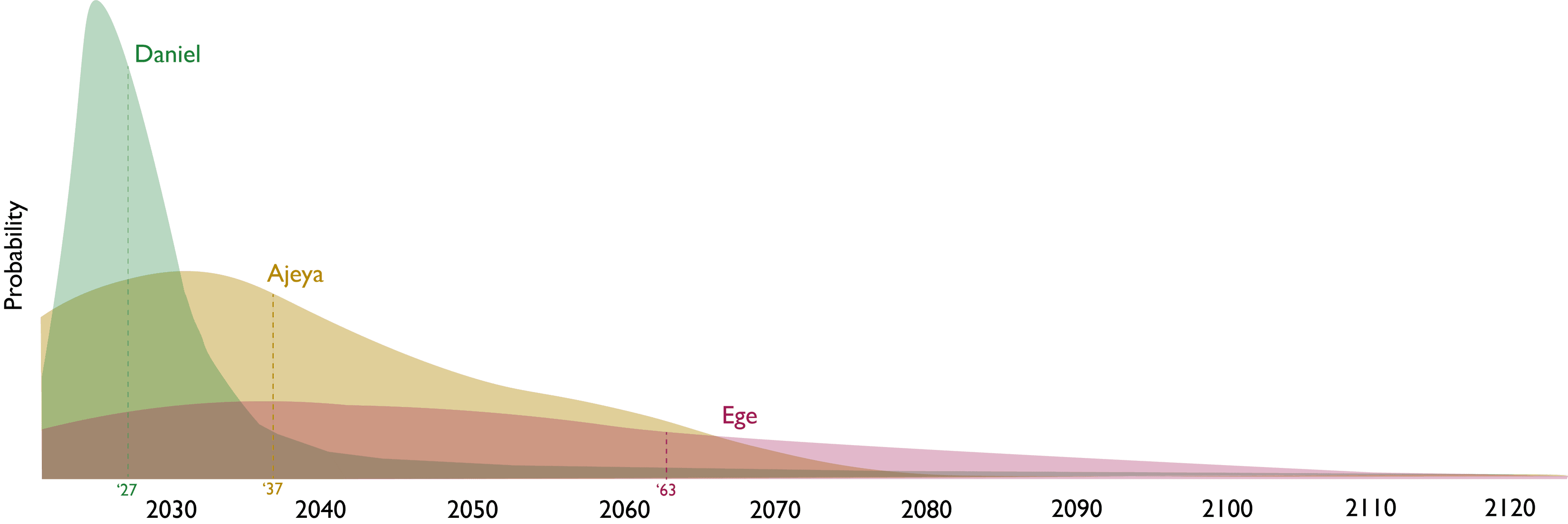 A particular danger in communicating timelines with a single number is that it raises the chance that this named year will come and go without incident, and the people who mentioned it (or the wider community they are part of) will be written off as having a false or discredited view. I think we’re going to see some of this come 2027 due to the vast number of people who heard about that scenario, combined with the fact that so many media outlets reported it as a sharp prediction, rather than as it was intended: an important illustrative scenario.