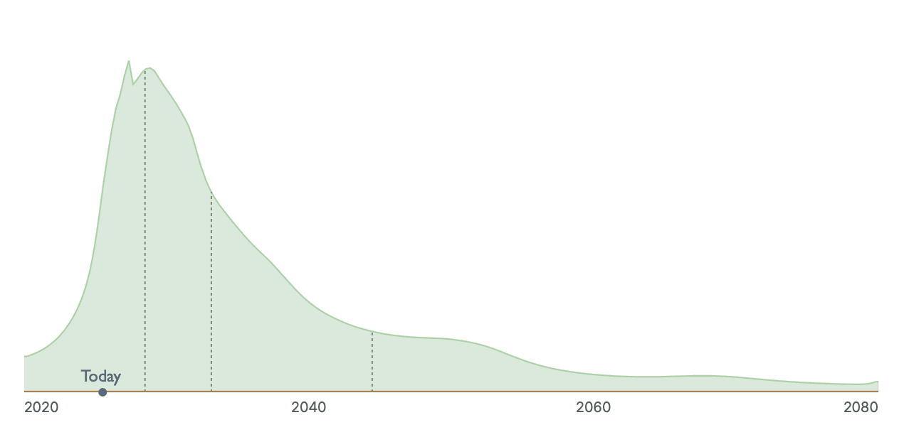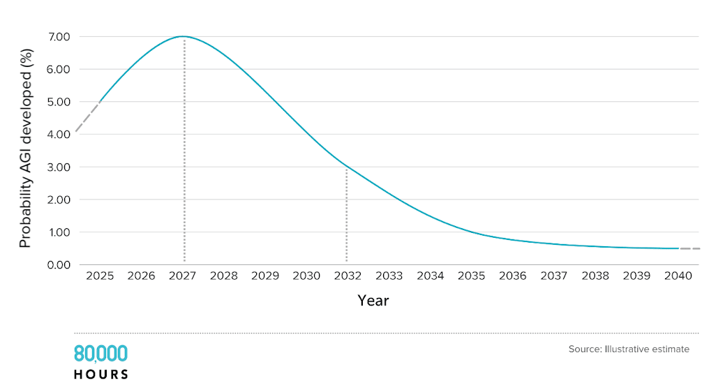 Here’s an illustrative distribution for AGI timelines used by Ben Todd of 80,000 Hours: