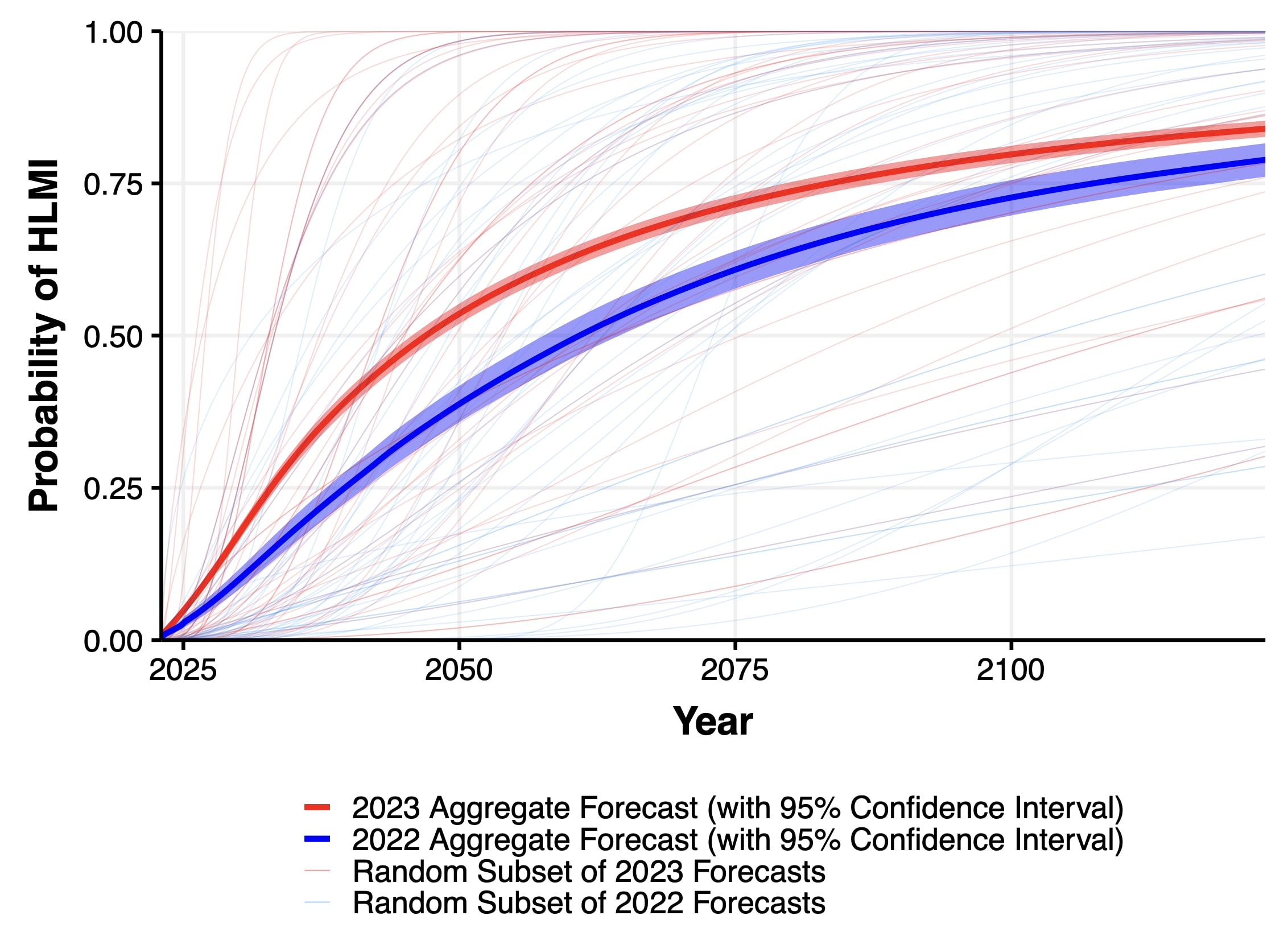 What about researchers working on AI capabilities? Grace et al surveyed thousands of AI researchers who were presenting at their top academic conferences. They surveyed the researchers in 2022 (blue) and 2023 (red) about when “unaided machines can accomplish every task better and more cheaply than human workers”: