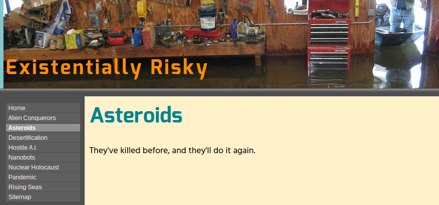 I would like your help generating content for the website—if you are willing to write a 100-word blurb, if you own a useful photo (or can create one, or know of one in the public domain), or if you have the URL handy for a webpage that lets you donate money to mitigating or preventing a specific x-risk, please post it in the comments! I can, in theory, do all of that work myself, but I would prefer to make this more of a community project, and there is a significant risk that I will get bored and give up if I have to literally do it all myself.