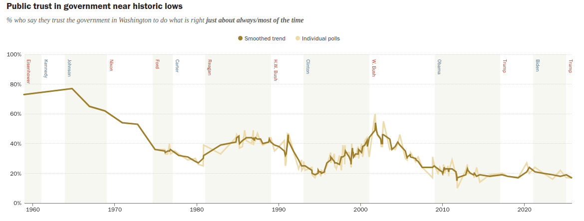 In modern times, as our institutions slowly degenerate (for demographic reasons due to an overproduction of “elites” who feel a semi-hereditary right to be in charge, who then fight each other rather than providing cheap high quality governance services to the common wealth) indirect ways of assessing trust in government have collapsed.