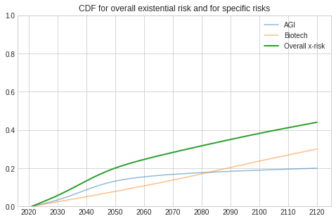 We made a Colab notebook that lets you forecast total x-risk as a combination of specific risks. For example, you construct pdfs for x-risk from AGI and biotech, and the notebook will calculate a pdf for overall risk. This pdf is ready to display as an answer. (Note: this example assumes AGI and biotech are the main risks and are statistically independent.)