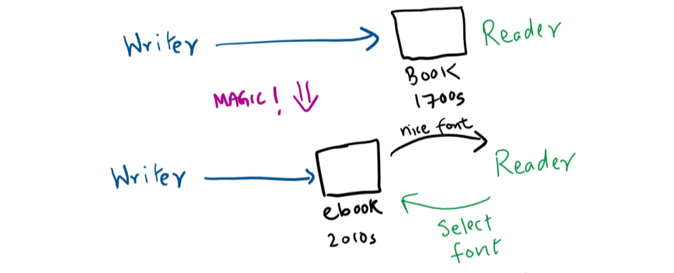 The introduction of e-readers and e-books presented new functionality which, for the first time, enabled readers to change the font of the book post-distribution. Rather than being forced to pre-define the formatting of a book’s font, the author/​publisher/​device manufacturer leaves that decision to the reader. In a small way, readers take part in the construction of the artefact. This may be of particular significance to a reader if commonly used print fonts are harder to read, for example, because of a vision impairment (or even just because of strongly-held font-preferences).