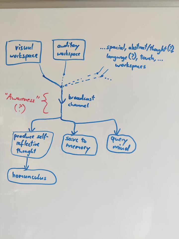 (I currently don’t know whether there is a “space of awareness” or whether (as in the image above) it’s just that some workspace is broadcasting its contents broadly.)