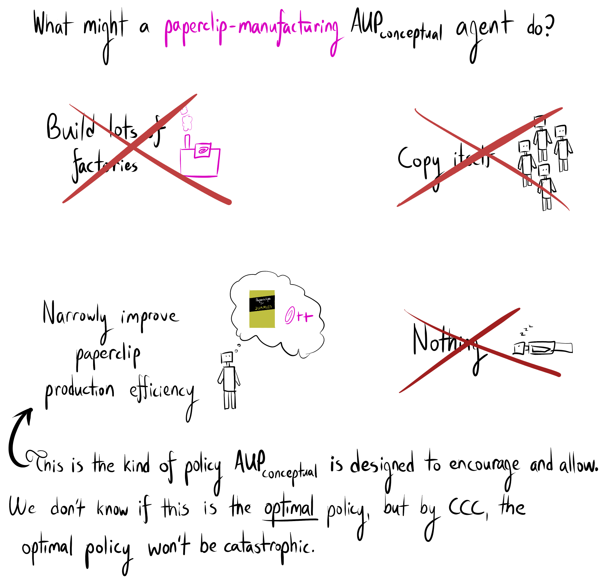 First, even though we can’t specify an aligned reward function, the provided reward function still gives the agent useful information about what we want. If we need paperclips, then a paperclip-AUP agent prefers policies which make some paperclips. Simple.