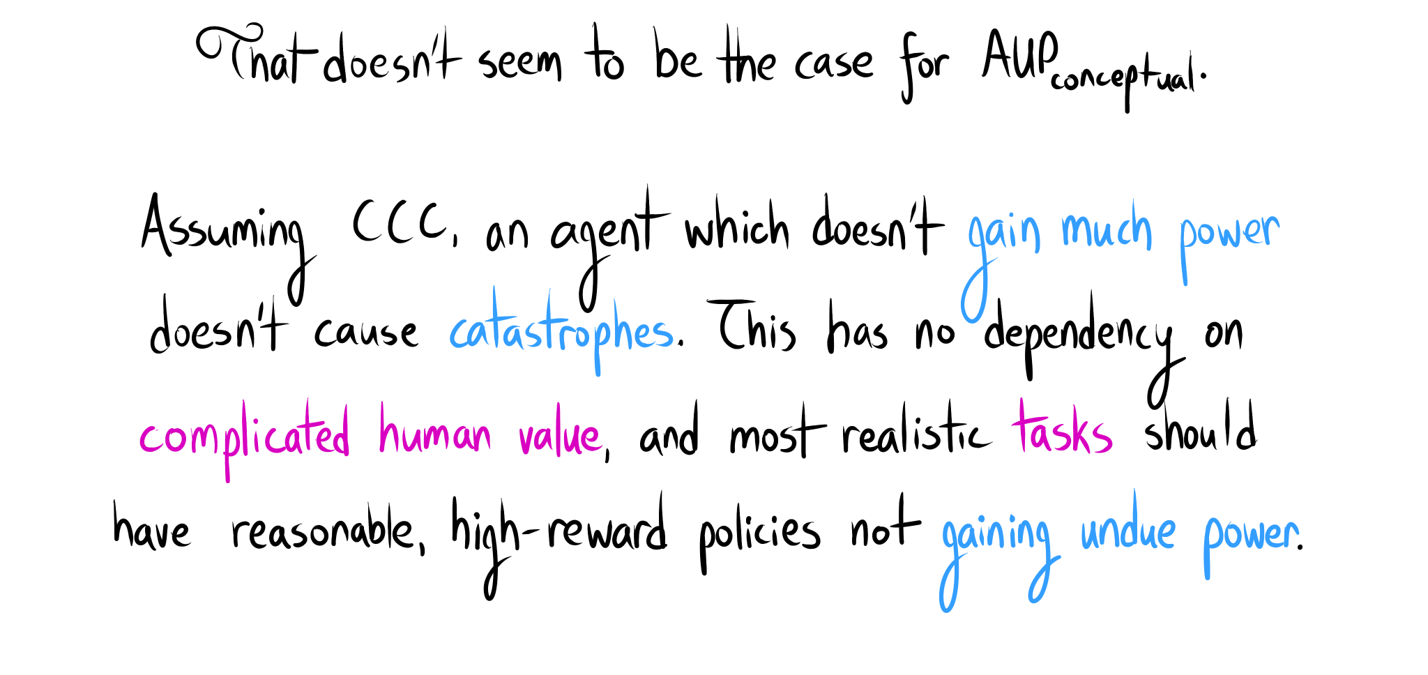 What if we want the agent to single-handedly ensure the future is stable and aligned with our values? AUP probably won’t allow policies which actually accomplish this goal – one needs power to e.g. nip unaligned superintelligences in the bud. AUP aims to prevent catastrophes by stopping bad agents from gaining power to do bad things, but it symmetrically impedes otherwise-good agents.