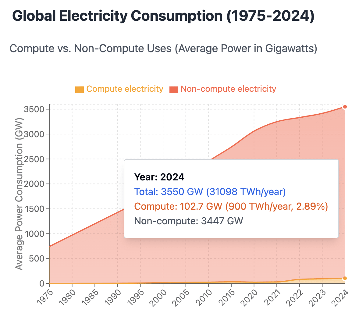 Electricity consumption by compute is growing much faster than overall electricity consumption (Claude Opus4 produced the plot):