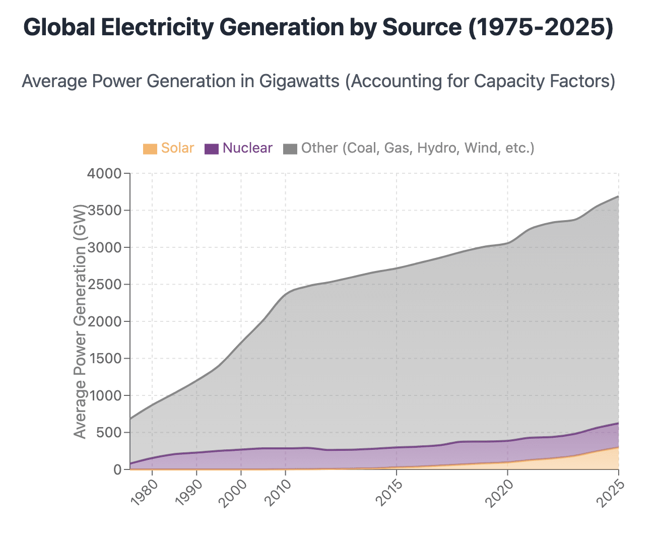 Solar is growing much faster than other energy sources (Claude Opus4 produced the plot):