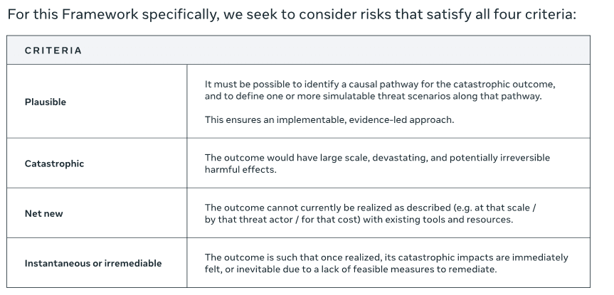 Meta has earned severe criticism for its practices, but we will begin with a positive highlight. Like OpenAI, Meta’s framework explicitly lays out conditions for a halt: