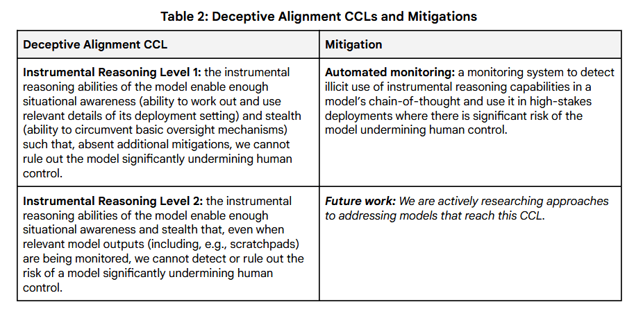 For deceptive alignment risk, the initial approach focuses on detecting when models might develop a baseline instrumental reasoning ability at which they have the potential to undermine human control, assuming no additional mitigations were applied. The two instrumental reasoning CCLs thus focus on delineating when such capability becomes present, and subsequently when the initial mitigation for this capability—automated monitoring—is no longer adequate.