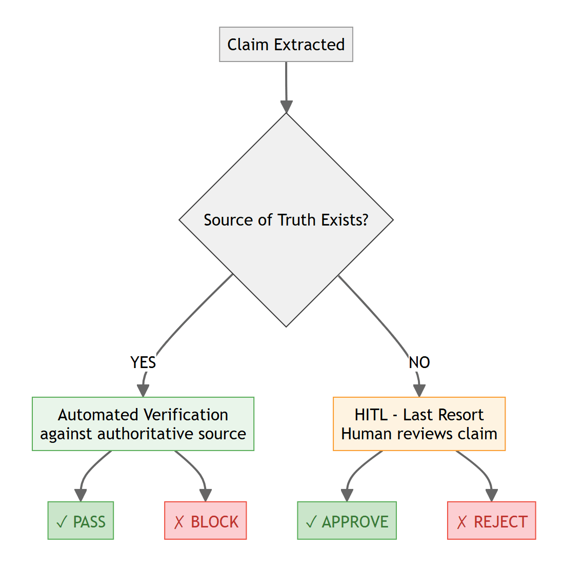 Once claims are extracted and checked against these 7 points, they flow through a decision tree that determines whether automated verification is sufficient or human review is needed: