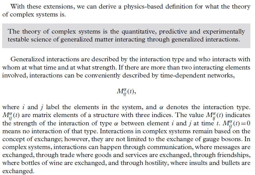 If you want a somewhat spicier, or maybe more ambitious vision of what complex systems is about, you could listen to this interview with David Krakauer. My guess is you’d largely bounce off of it, though I do think it’s pretty exciting (albeit the interview is denser than it appears to be at first glance). He talks about understanding “telic” phenomena (or some similar terminology), which (my rough paraphrase) he understands as emerging from the specific constraints that you get from adaptive systems that evolve and meta-evolve, etc. IMO this is interesting from an “understanding the foundations of agency/​intelligent behavior” angle, and e.g. you end up trying to explain in naturalistic terms how things like “back-wards causation” characteristic to agency/​planning can arise from simple dynamics.