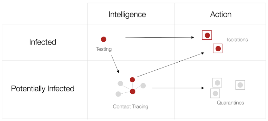 Tracing finds contacts of infected people, and they are quarantined (or isolated if they test positive)