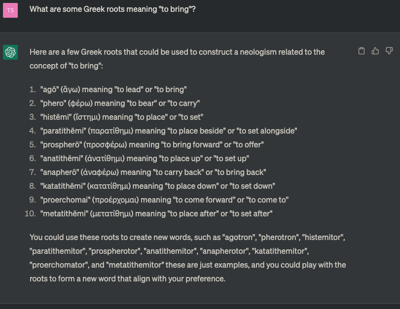 See the section “What this essay is not about”. I’m talking about the sort of lexicogenesis that you do when you’re trying to describe something that you want to describe, but don’t have the words to describe. I do think it’s absolutely key to hug the query, stay close to the need——treat as very valuable the data of what words are actually in real life needed, and the specific criteria provided by those contexts of need. Having a need, having a sentence that you want to say but that’s clumsy without the new word, is the gold standard for when lexicogenesis is actually wanted. It’s not cringe or crankish to say “electron” or “methylation” or “phylogenetic” or “diffeomorphic”, if you’re talking about those things.