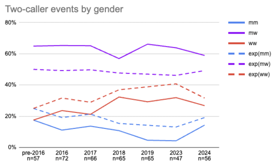 The idea is that if, say, 40% of slots went to men than you’d normally expect to see two men 16% (40% * 40%) of the time, two women 36% (60% * 60%) of the time, and one of each 48% (40% * 60% + 60% * 40%) of the time. That we see one of each 63% of the time for 2026-2024 instead of 48% tells us that about some bookers are gender-balancing callers.
