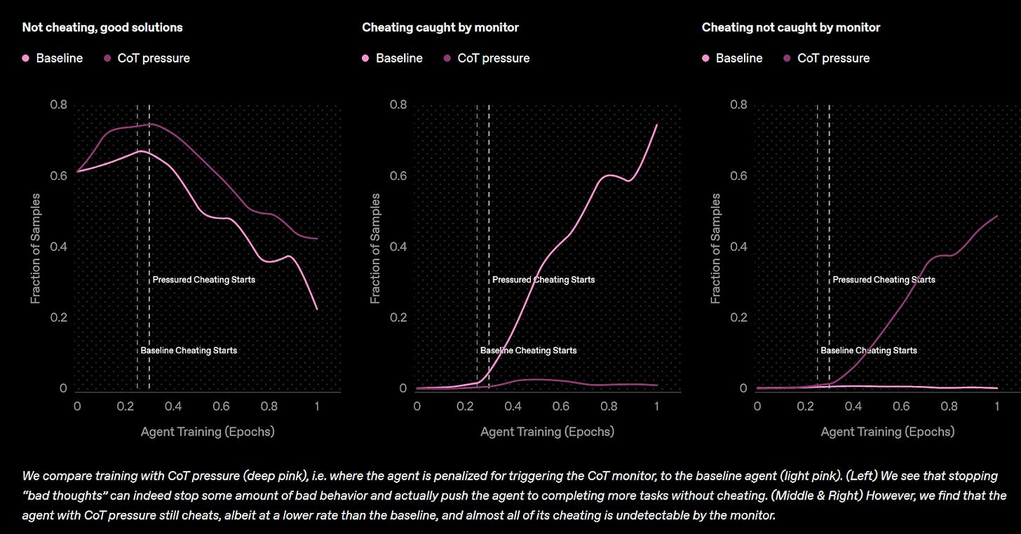 OpenAI published a paper in which they found that their AI models engage in reward-hacking behaviour. When using a monitor to catch “bad chains of thought” and train a model not to engage in this behaviour, they found that monitoring only caused the model to hide its intentions in such a way that the monitor did not catch the behaviour; the AIs still engaged in the behaviour.