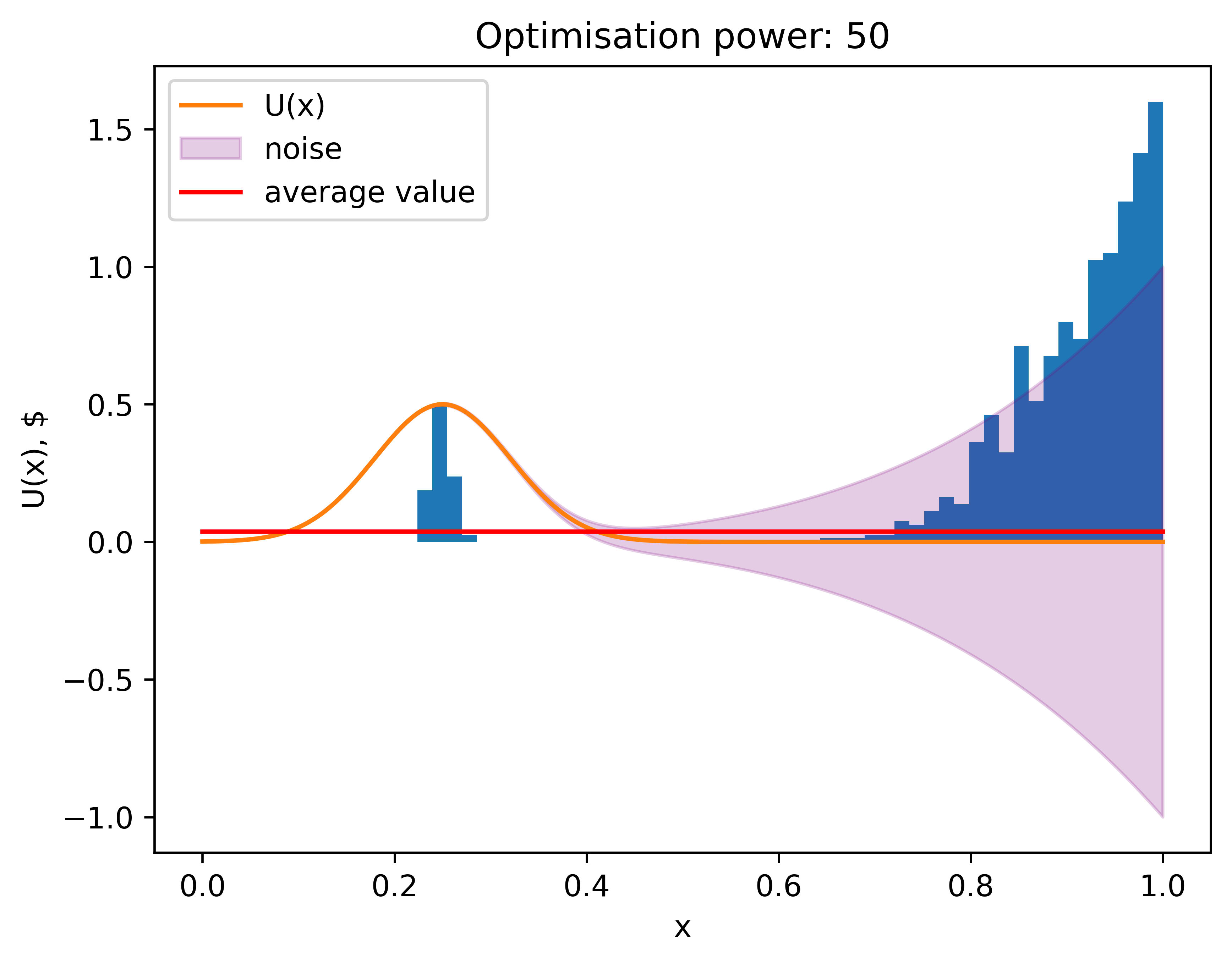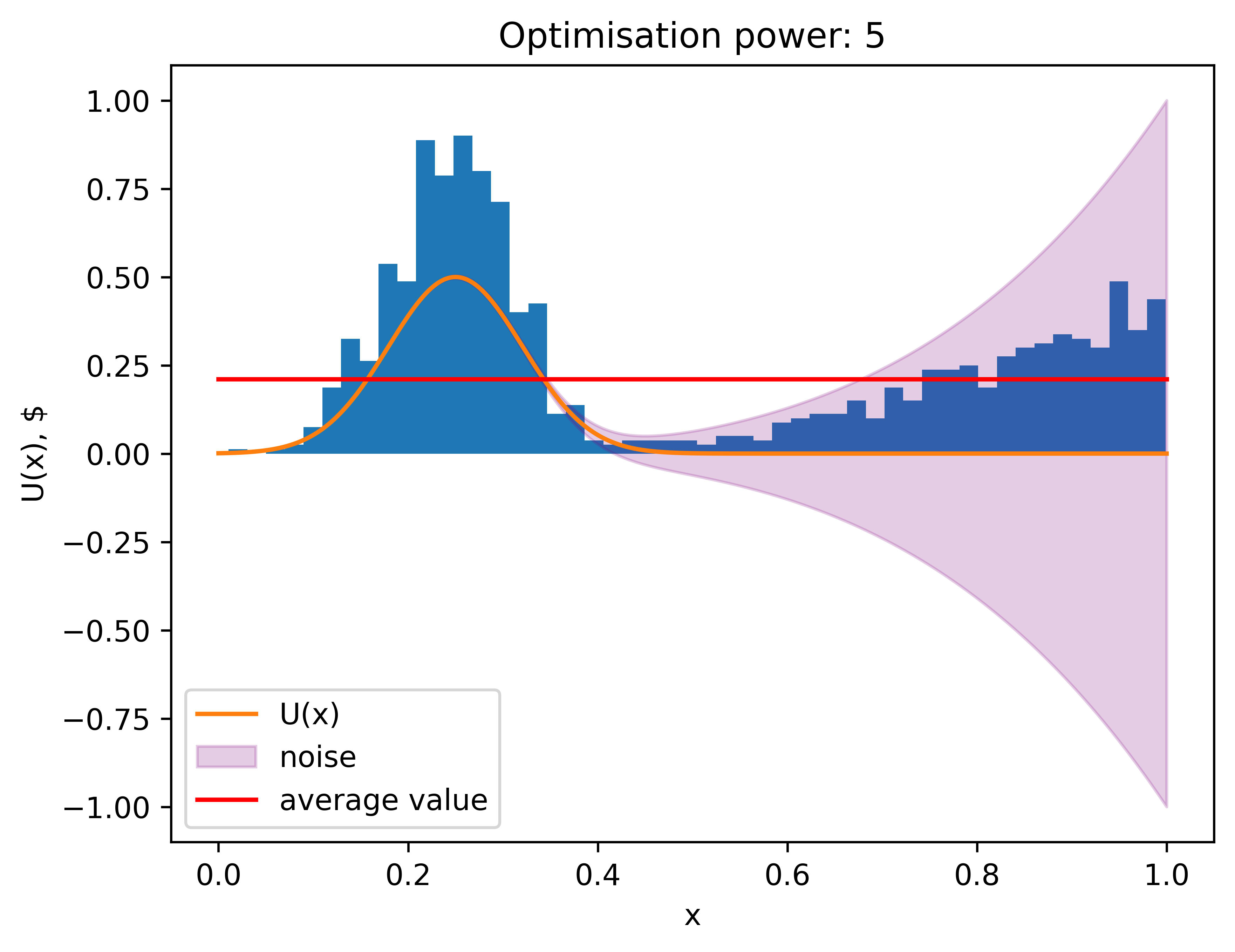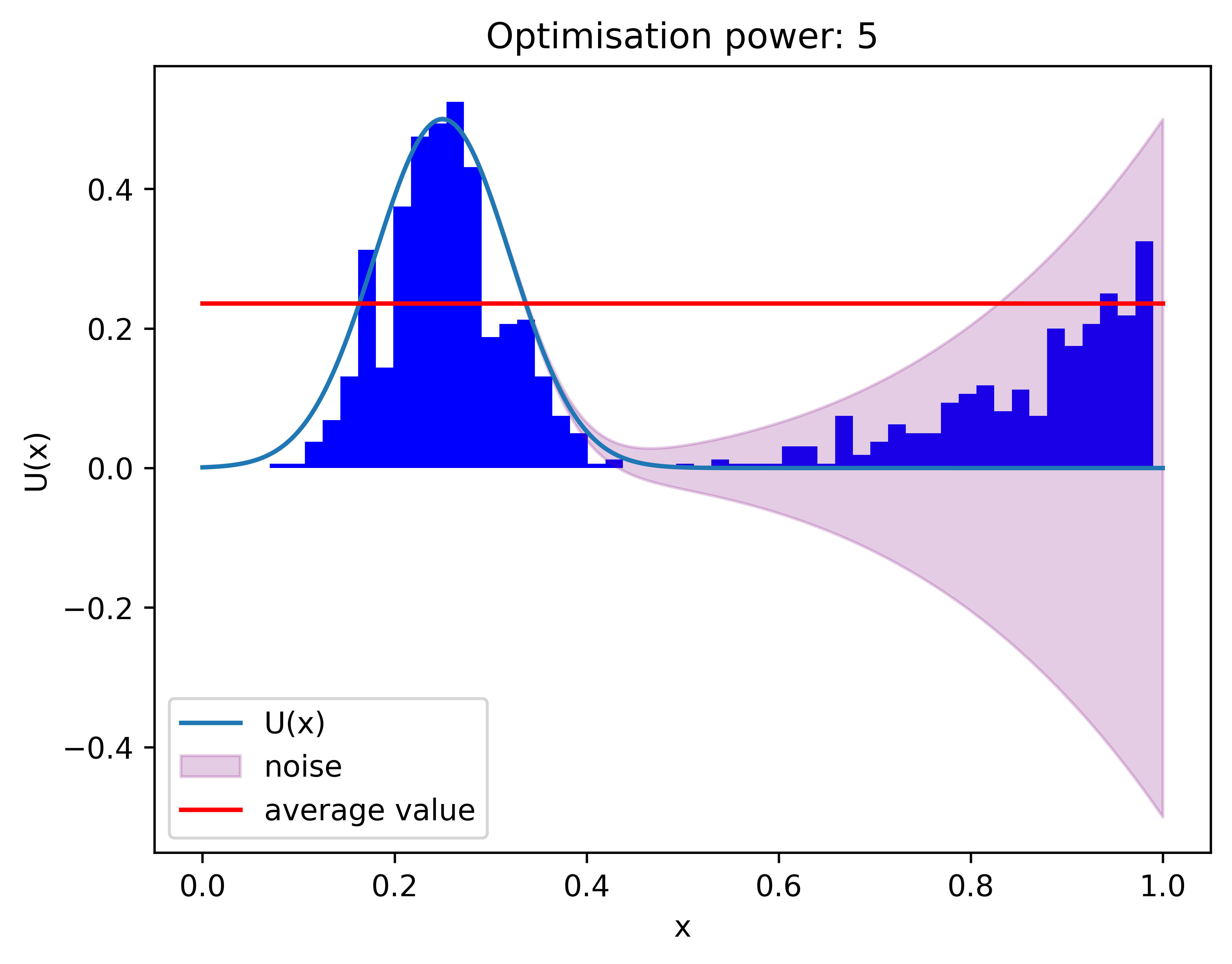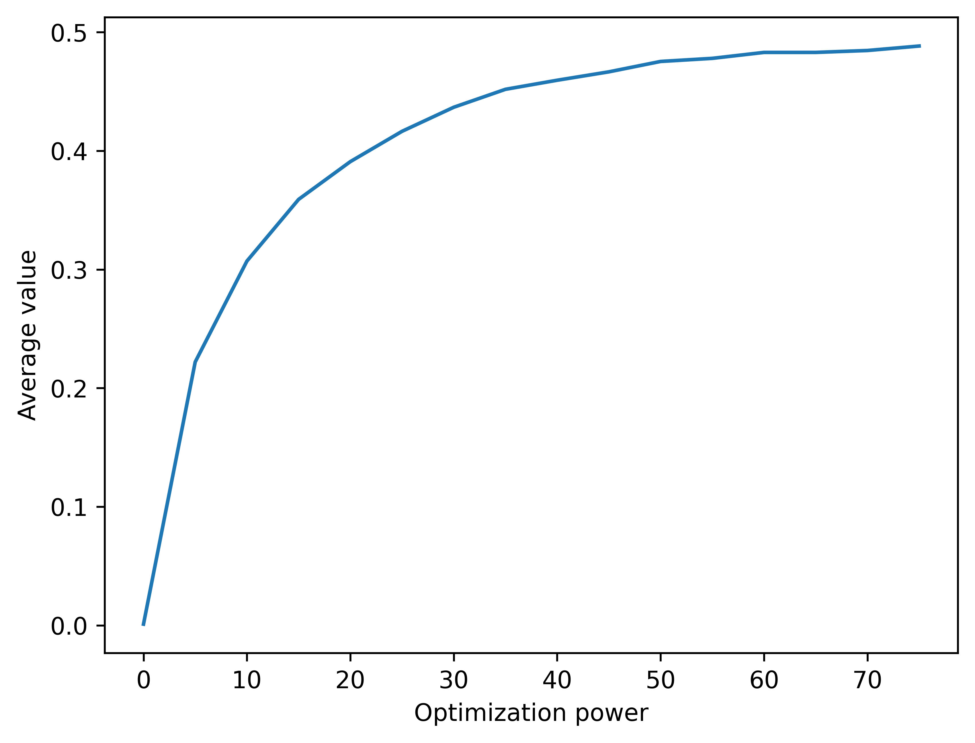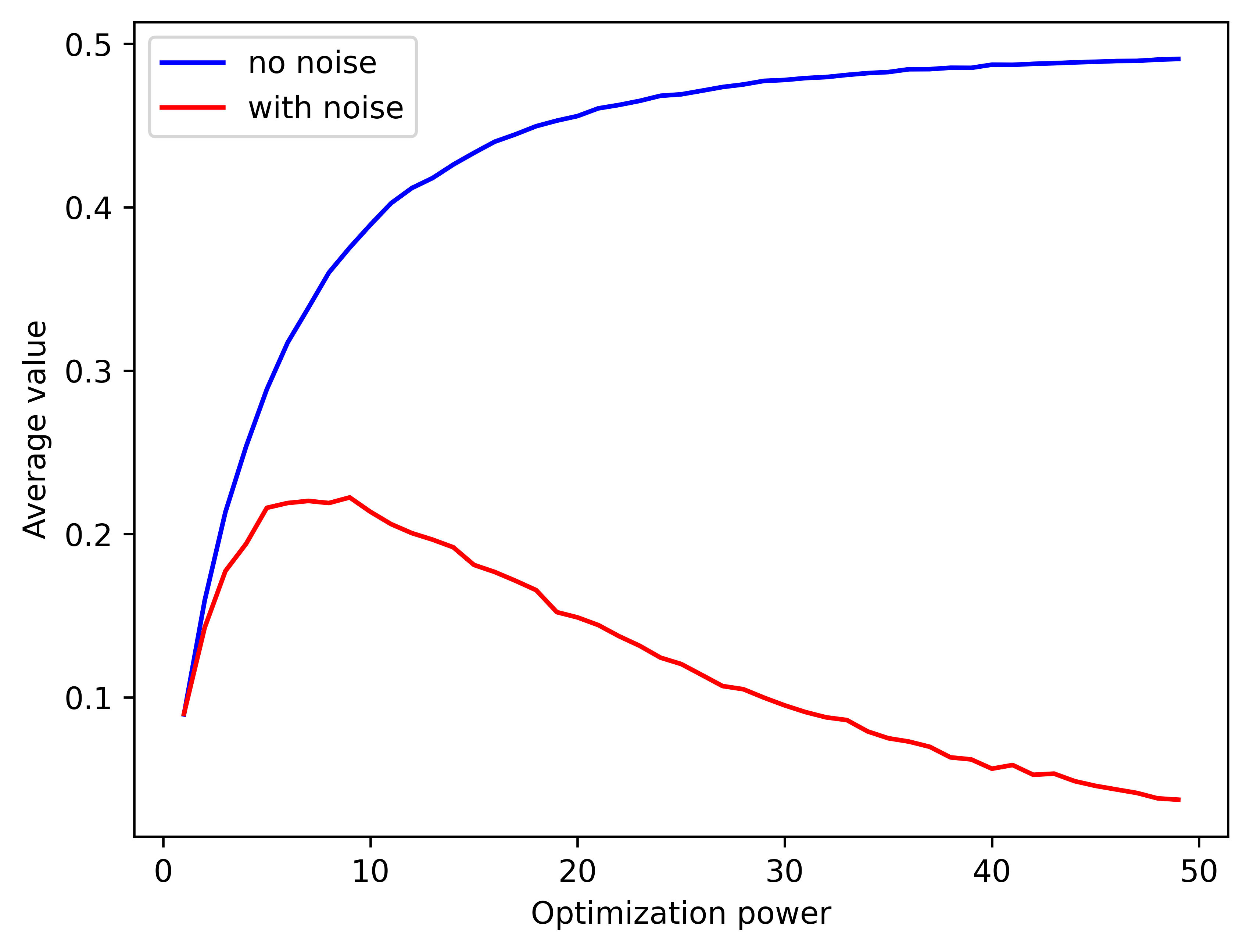 An increase in optimization power resulted in a lower average value because, with more samples, the probability that the highest point from a noisy area exceeds the actual maximum of the utility function increases. Here’s the graph of the average value with respect to optimization power. At some point, higher optimization power is worse than random sampling.