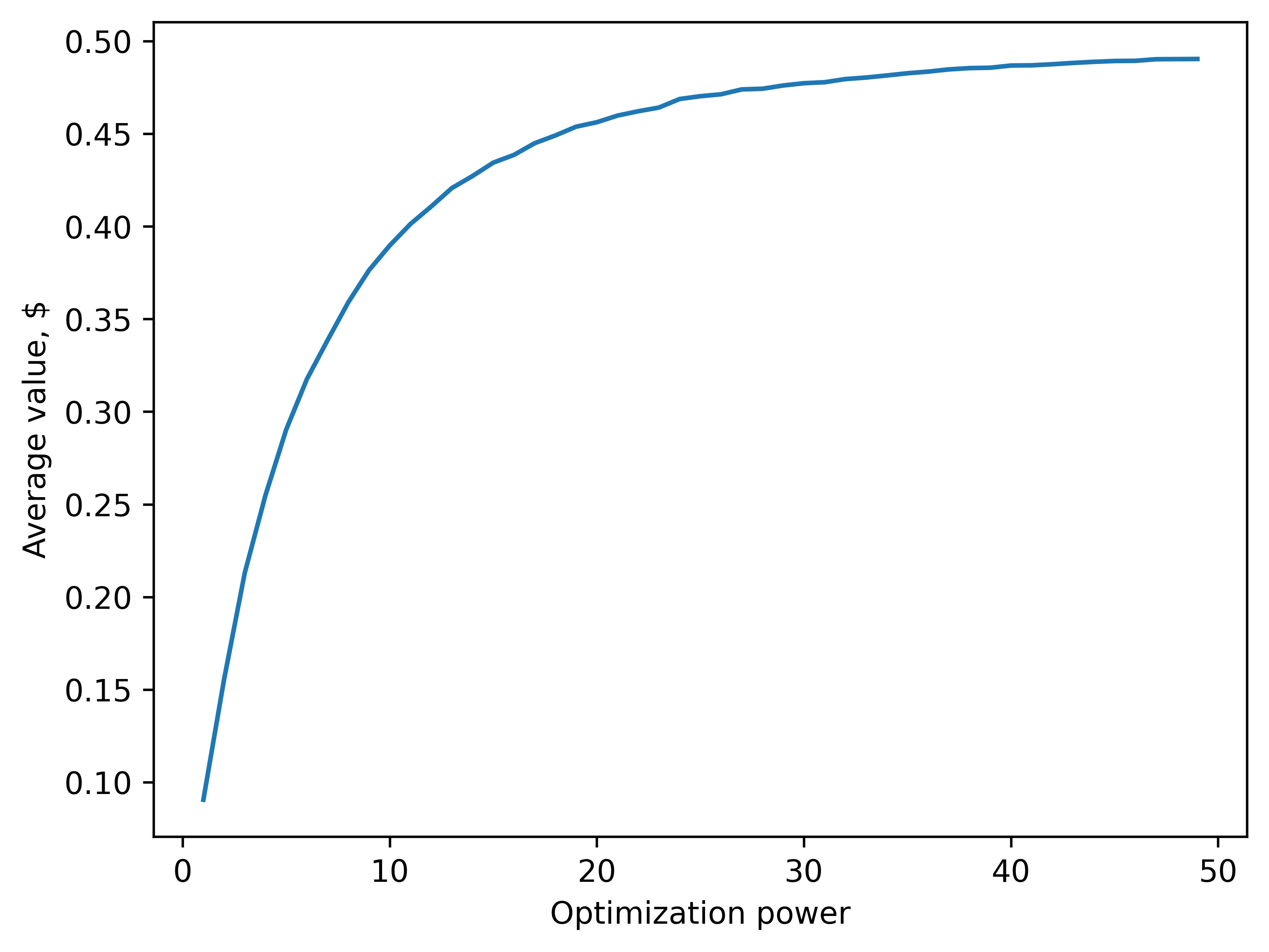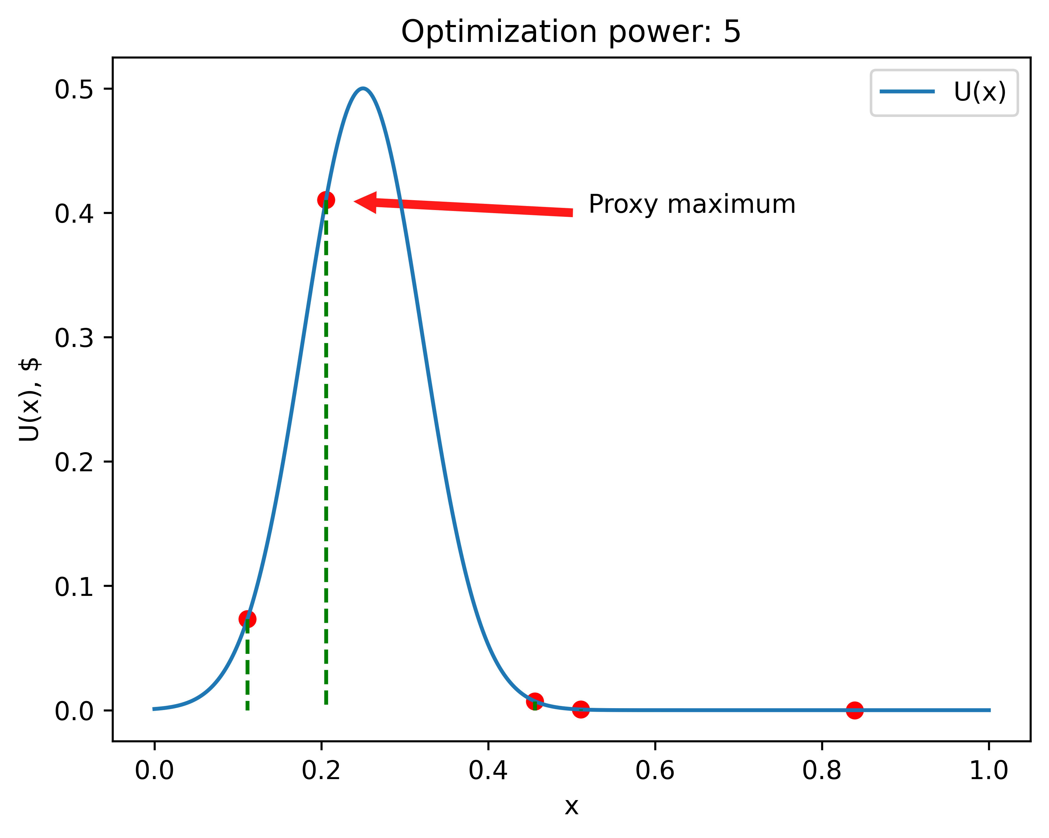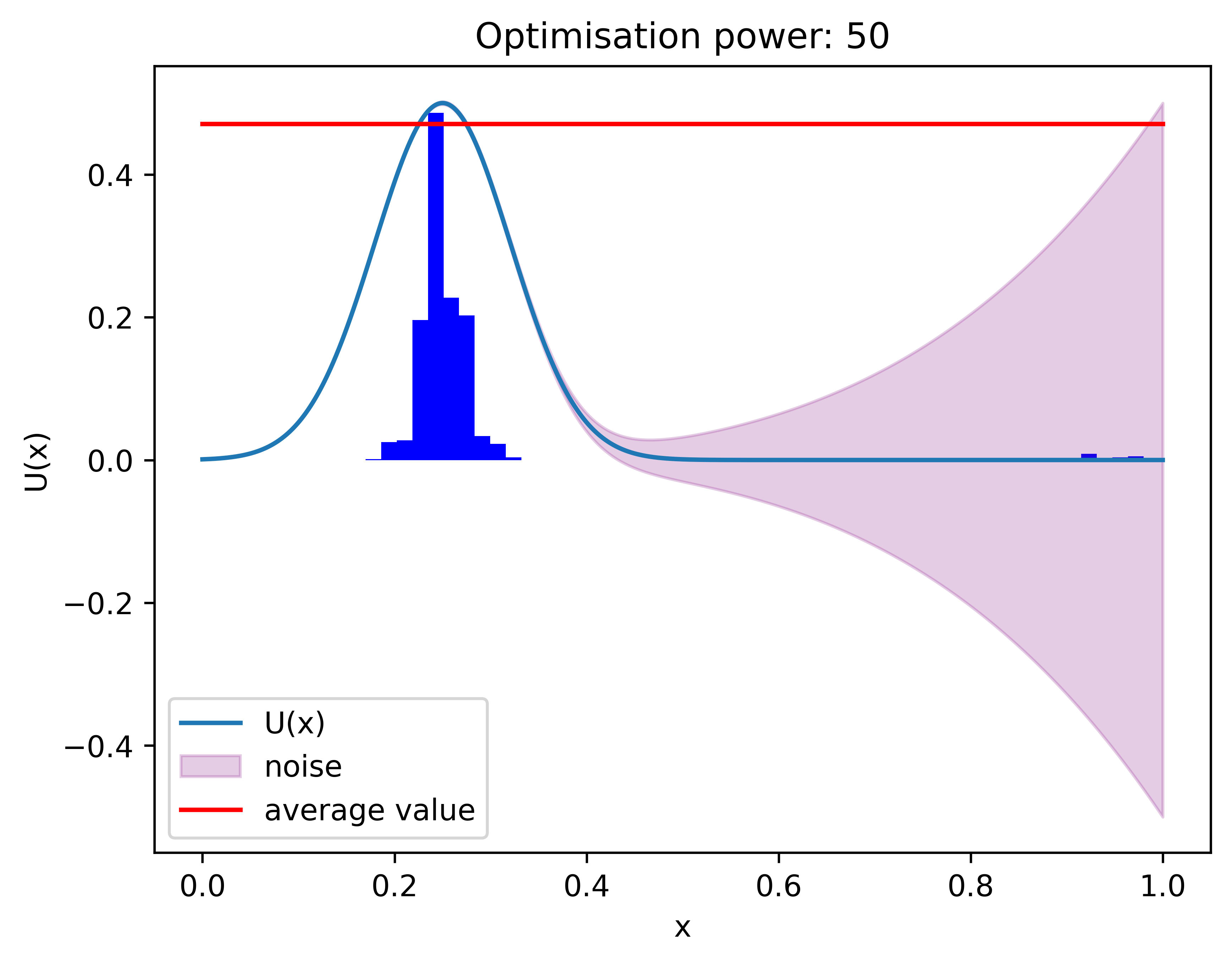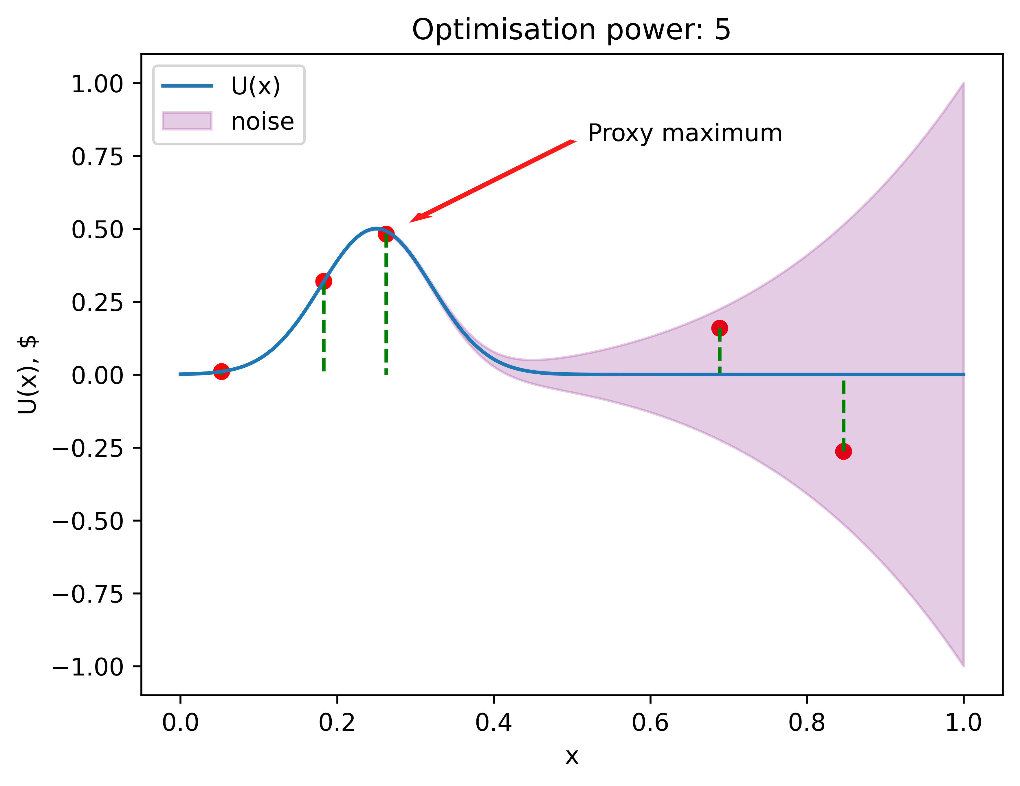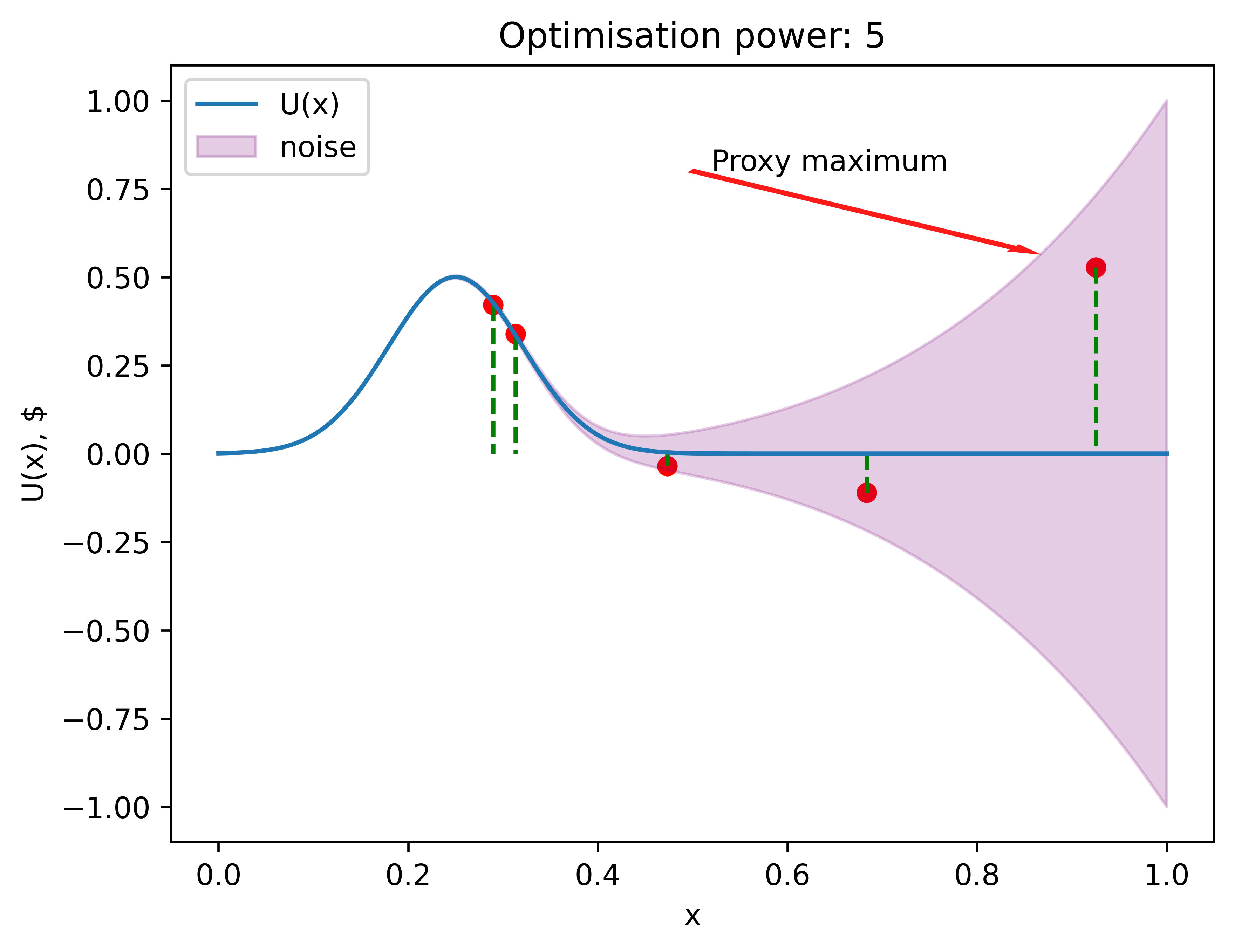 An increase in optimization power resulted in a lower average value because, with more samples, the probability that the highest point from a noisy area exceeds the actual maximum of the utility function increases. Here’s the graph of the average value with respect to optimization power. At some point, higher optimization power is worse than random sampling.