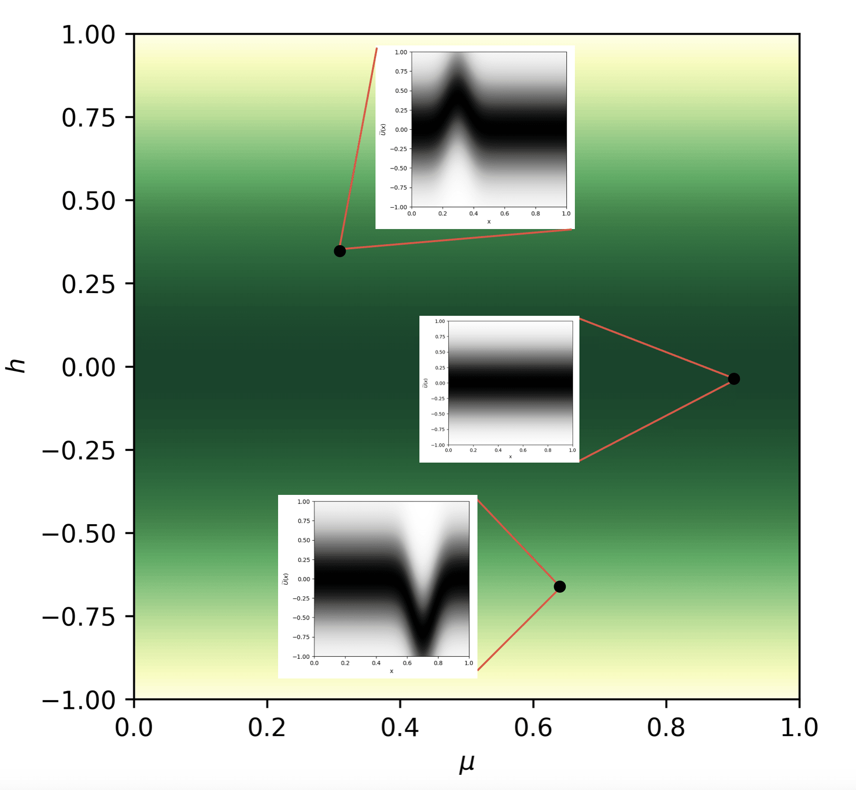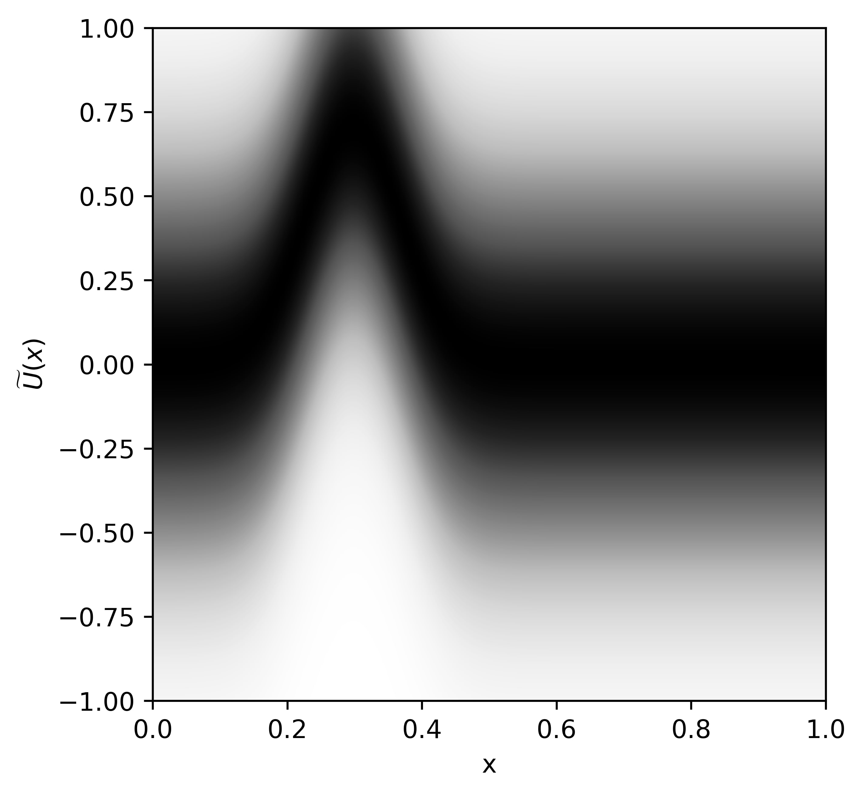 Colormap of one such hypothesis (which shows with what probability each pair can be outputed) with a specific value of peak hight and -coordinate of this peak would look like this (the blacker the region, the higher the probability):